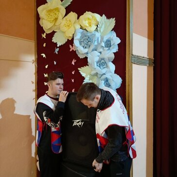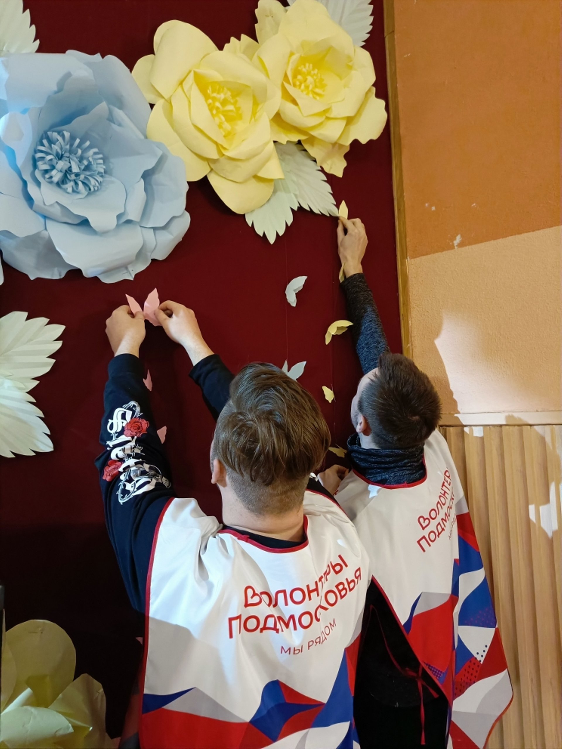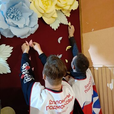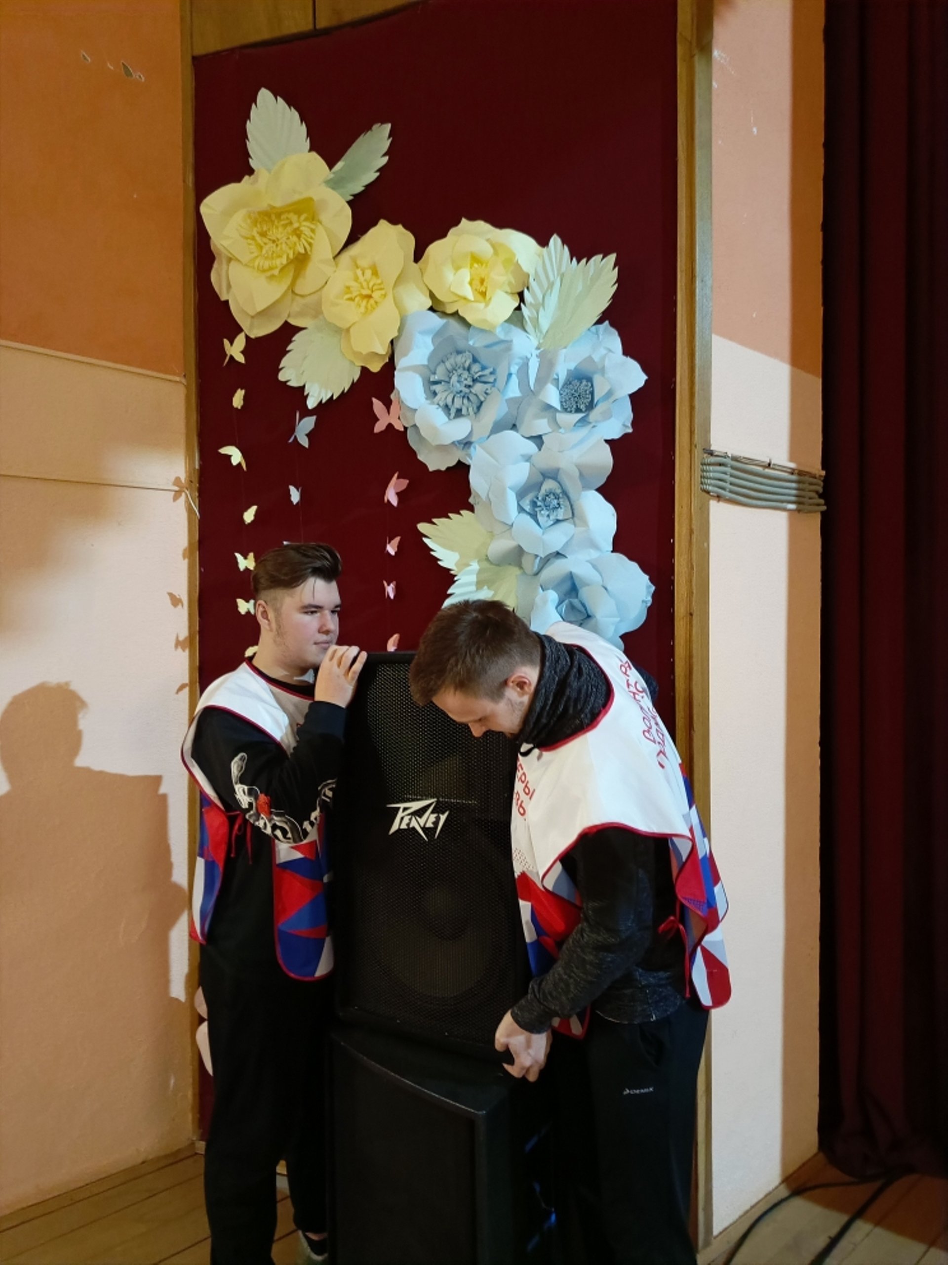 Волонтёры помогают к подготовке концертной программы, посвящённой Международному женскому Дню 8 марта "Для любимых и единственных". Украшают сцену, устанавливают звуковое оборудование, встречают гостей.