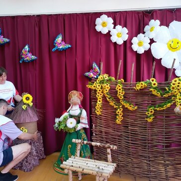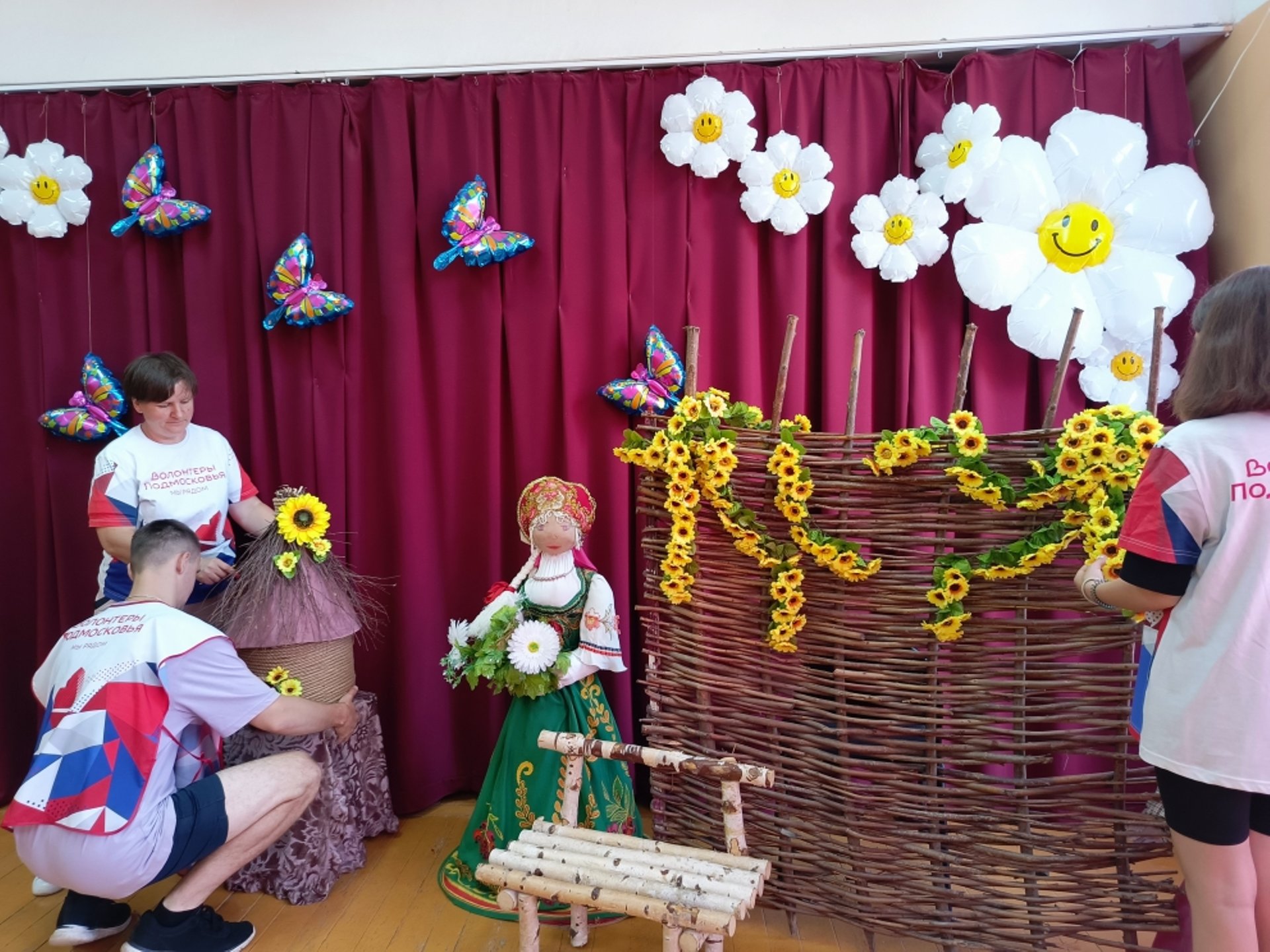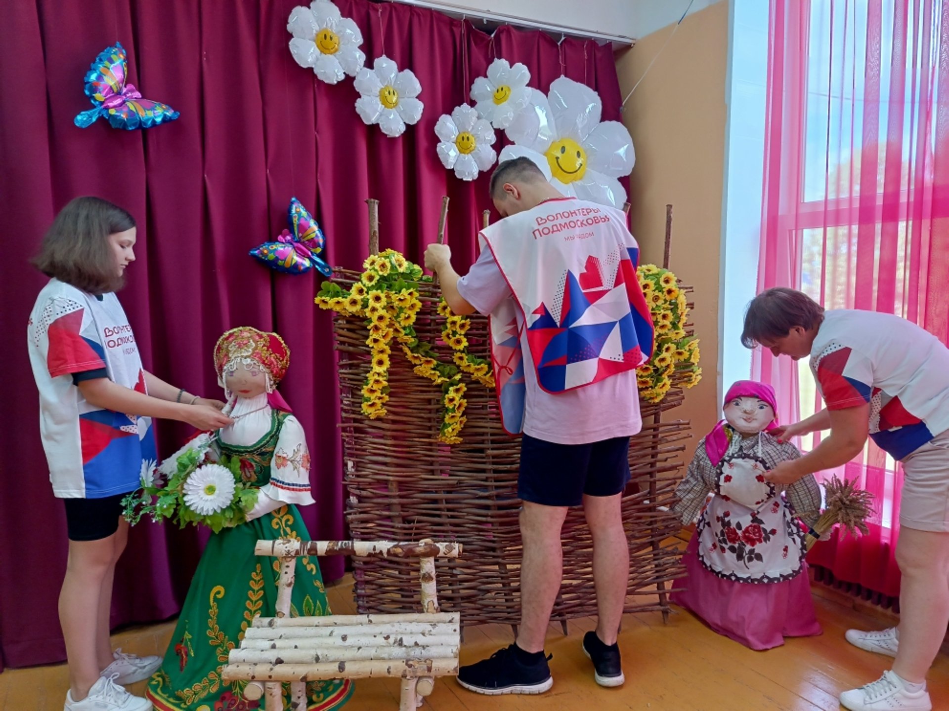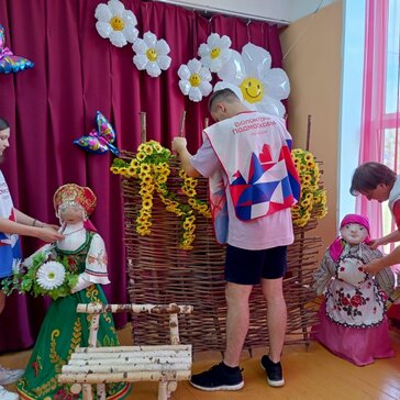 Волонтёры помогают в организации и проведении мероприятия: украшают зал, готовят костюмы для сценки, встречают гостей и провожают их в зал.