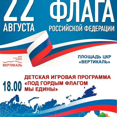 В День Российского Флага на площади МБУК Пущинский ЦКР "Вертикаль" будет проводится Детская игровая программа "Под гордым флагом мы едины". Ребята смогут познакомиться с символами и традициями современной России. В программе будут проводится игры, эстафеты, танцы, песни, загадки о России. участники Волонтёрской группы "Свежий ветер" и активисты Движения Первых МБУК Пущинский ЦКР "Вертикаль" помогут в проведении программы.