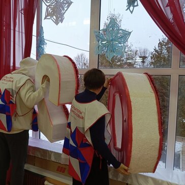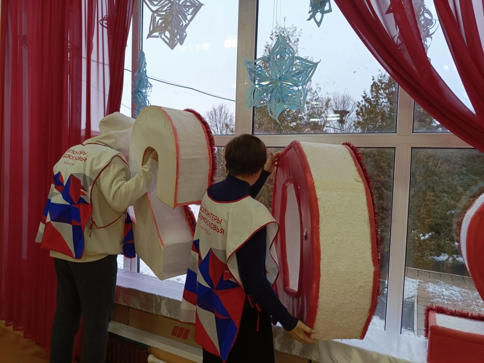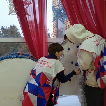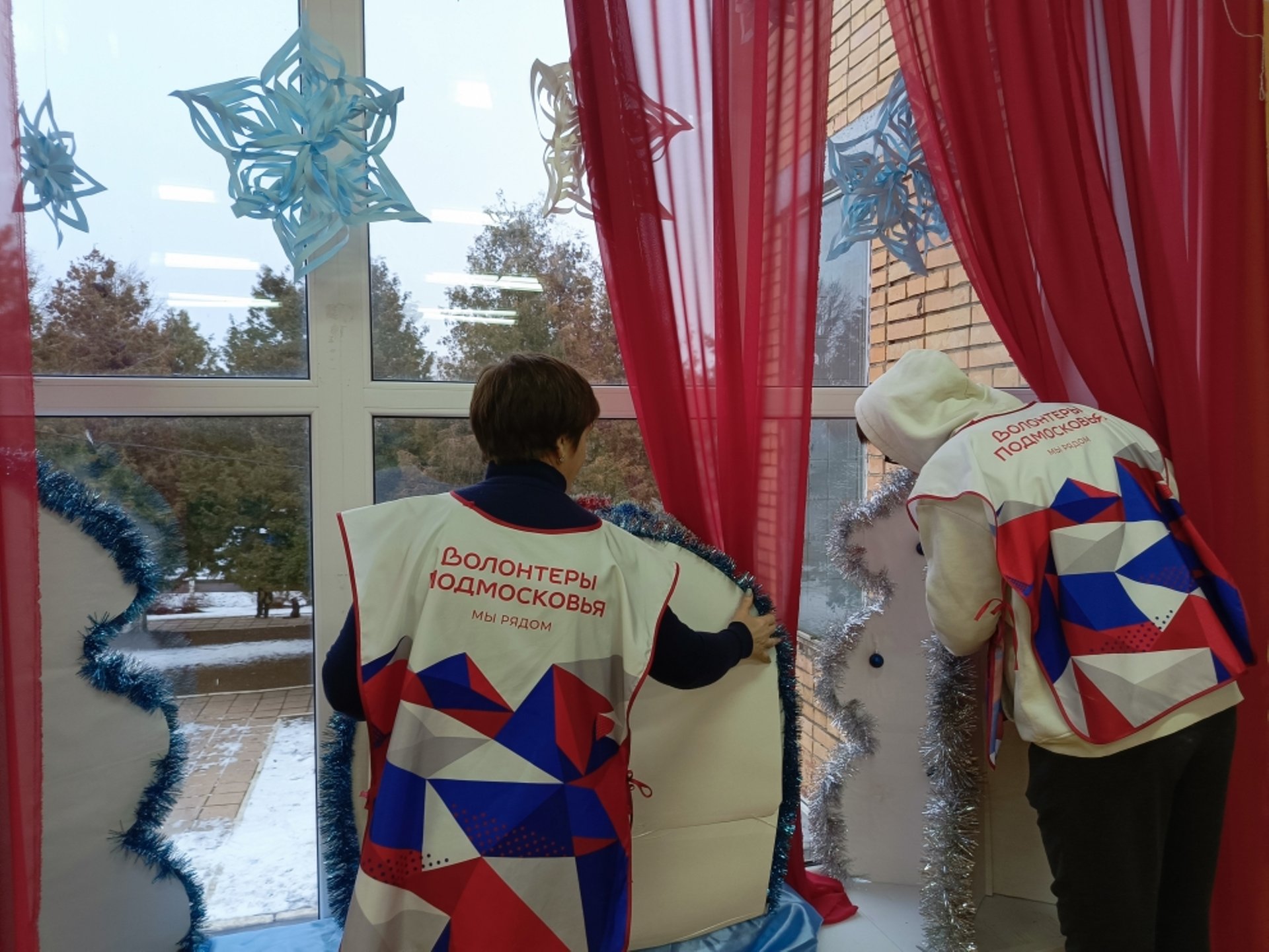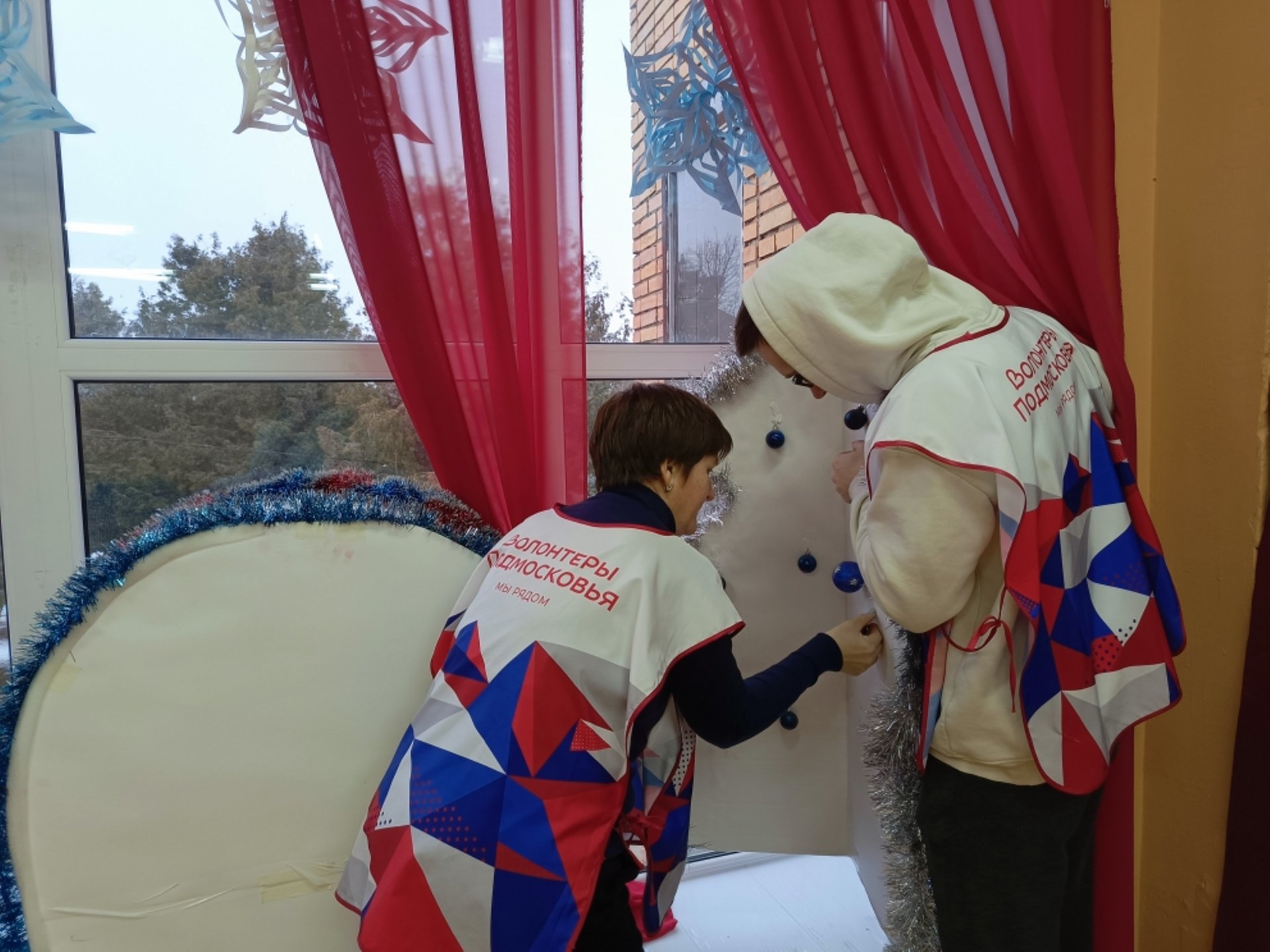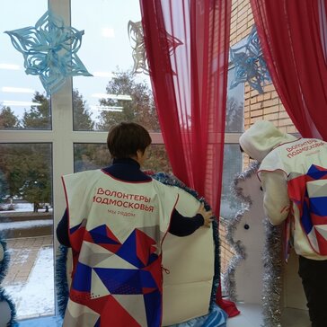 Волонтеры принимают участие в изготовлении снежинок, атрибутов для украшения окон. Украшают окна в здании Дома культуры.