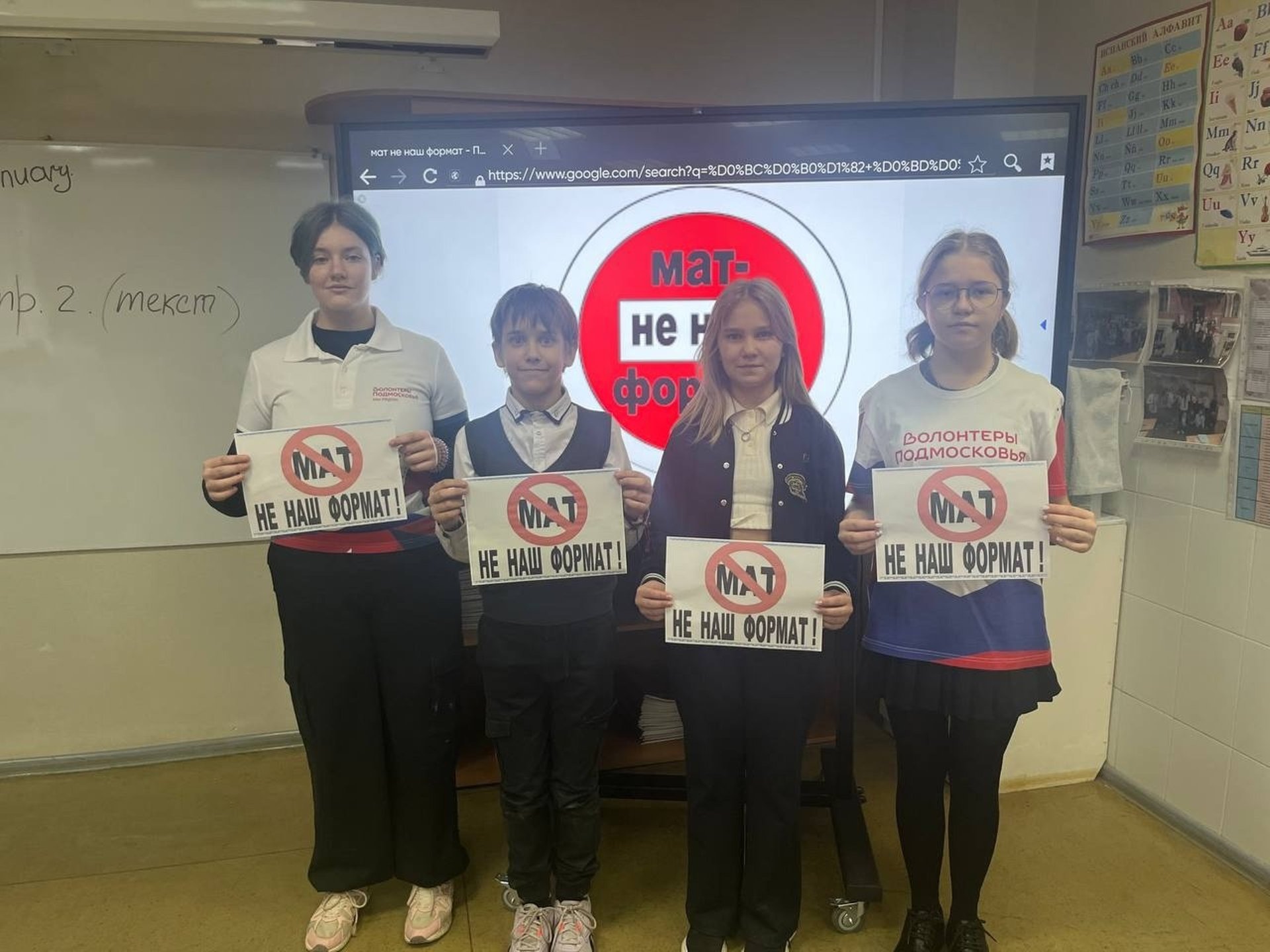 Волонтеры Серебряных Прудов провели профилактическое мероприятие "Мат - не наш формат!" среди старшеклассников МБОУ "СОШ имени Маршала В.И. Чуйкова". Добровольцы напомнили ребятам о речевой безопасности, о сохранении настоящего и великого русского языка взамен навязанных стереотипов о мате, как национальном явлении, о том, что мат растлевает детей и подростков, разрушает духовное основание народа России.