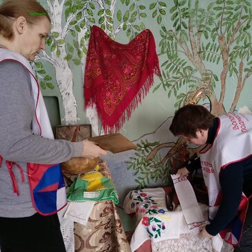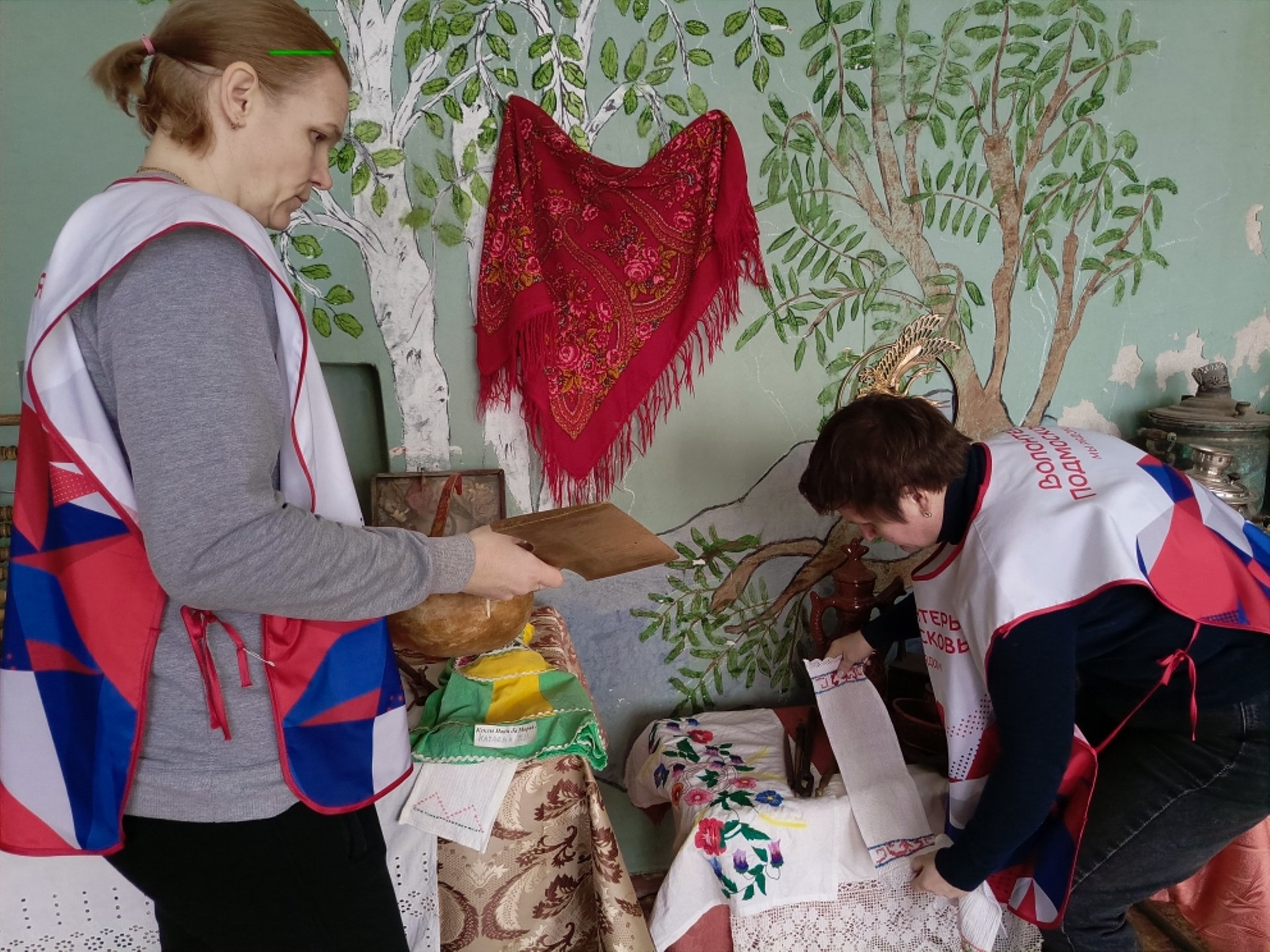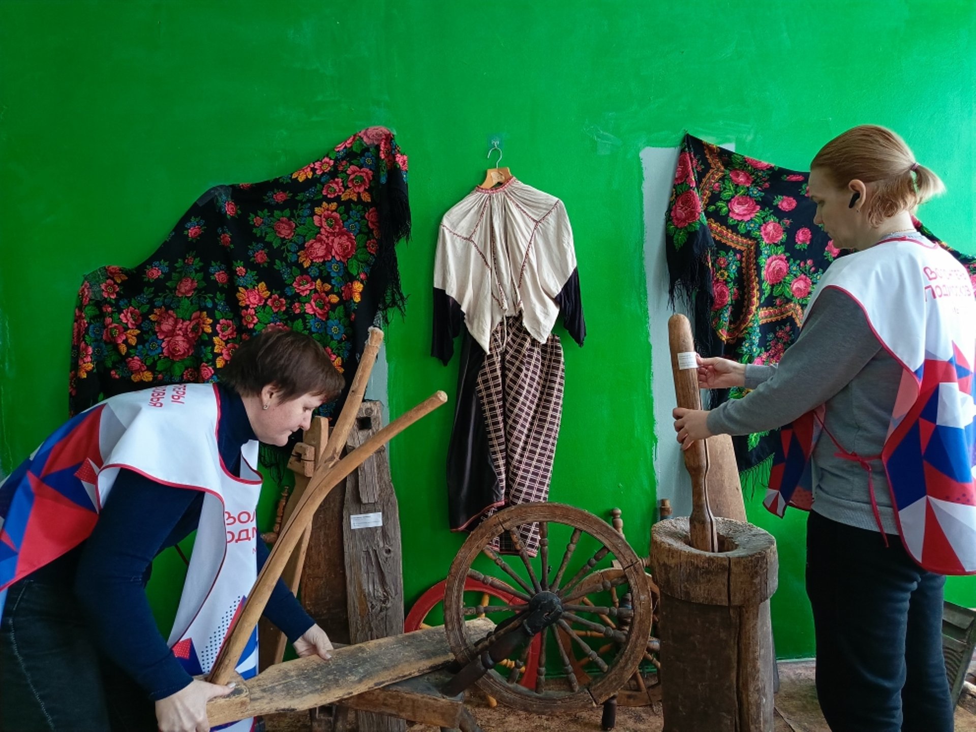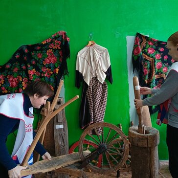 Волонтеры расставляют экспонаты старины, развешивают народные костюмы, готовят беседу "Край родной"