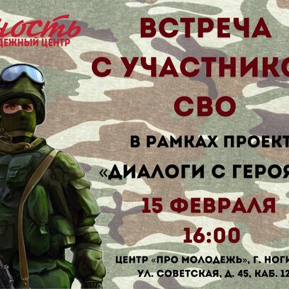 15 февраля в 16:00 в Молодежном центре «Юность» пройдет встреча в рамках проекта «Диалоги с Героями».