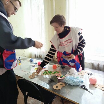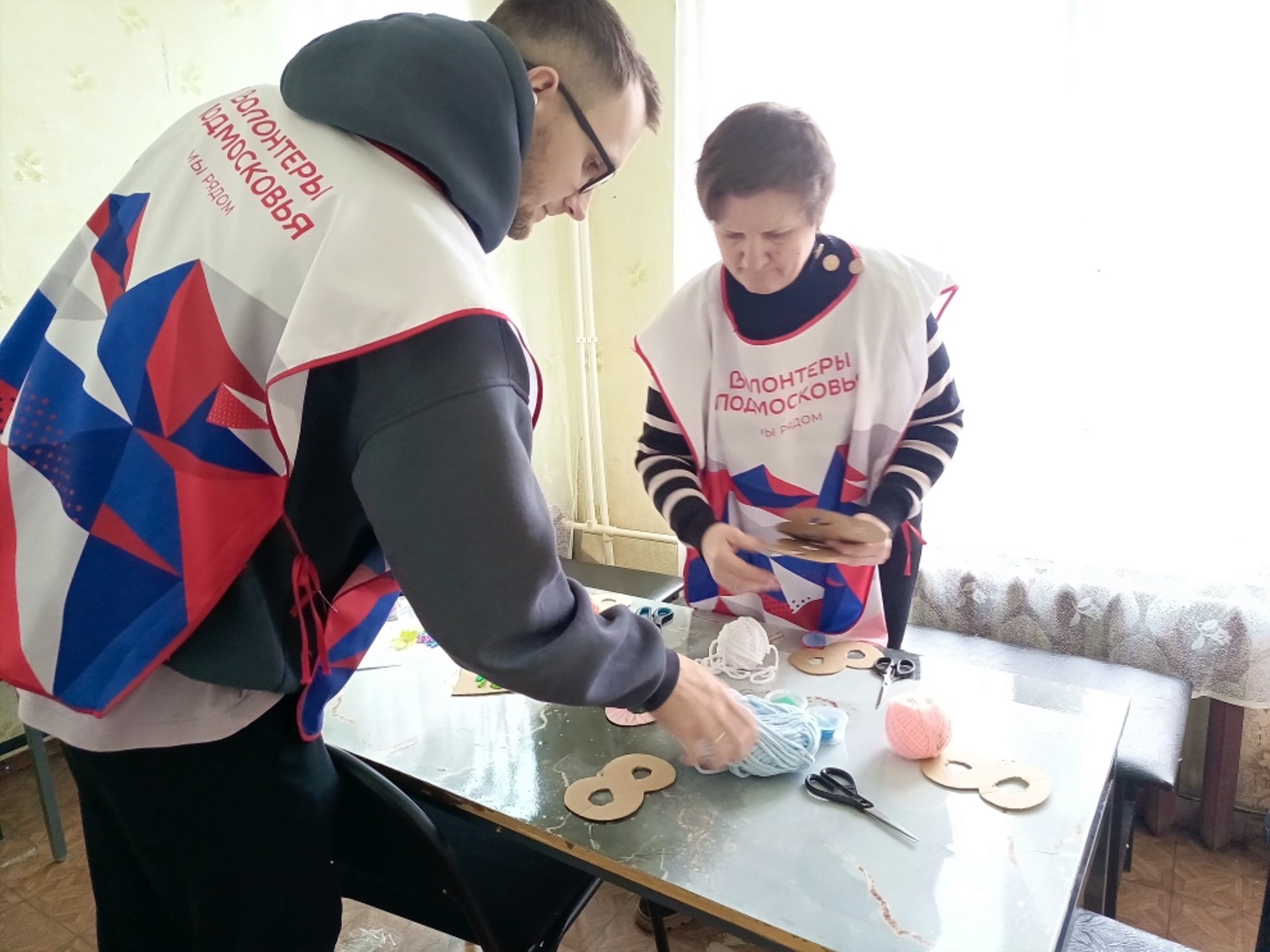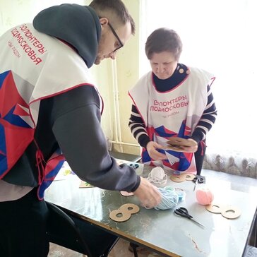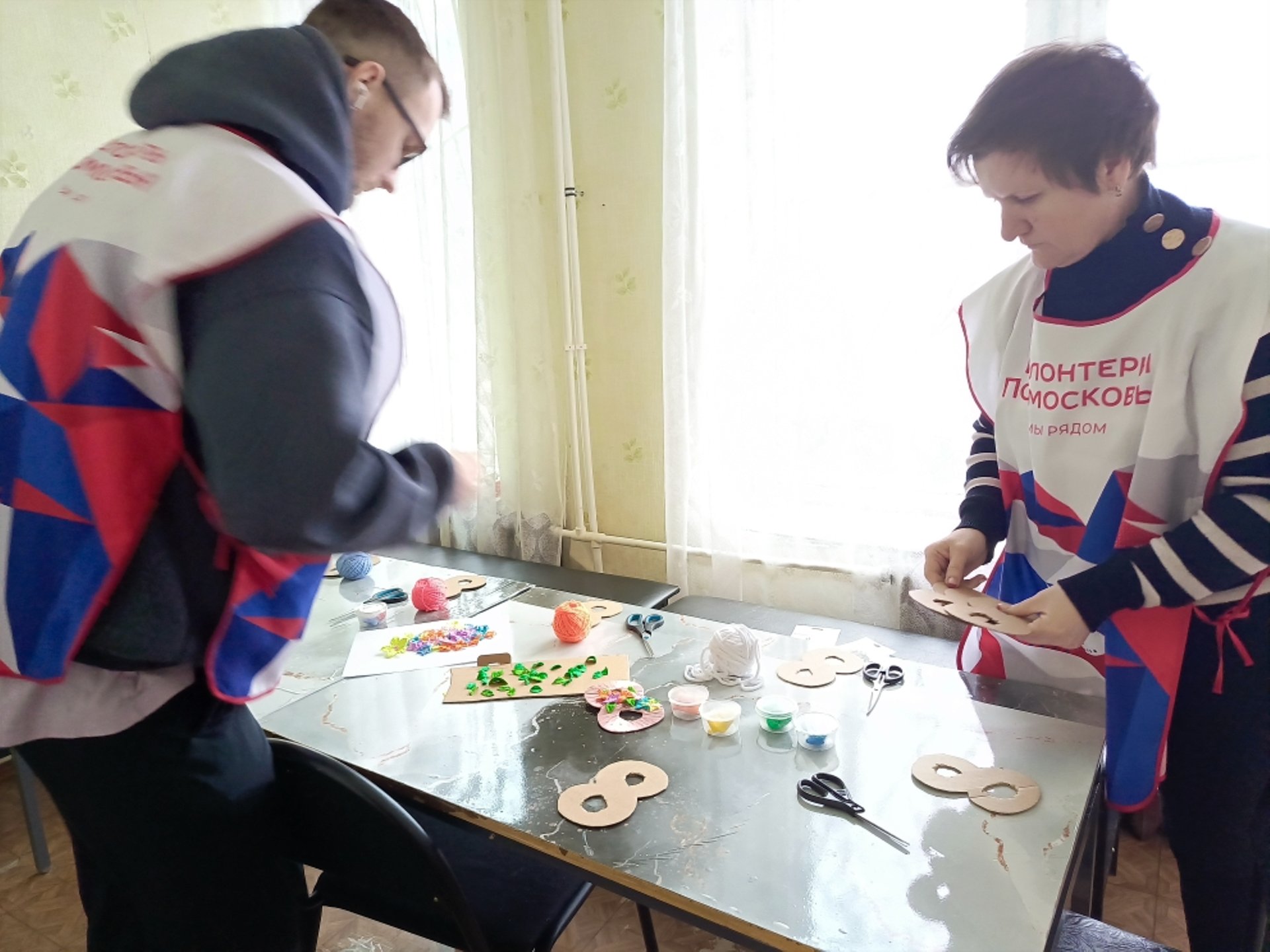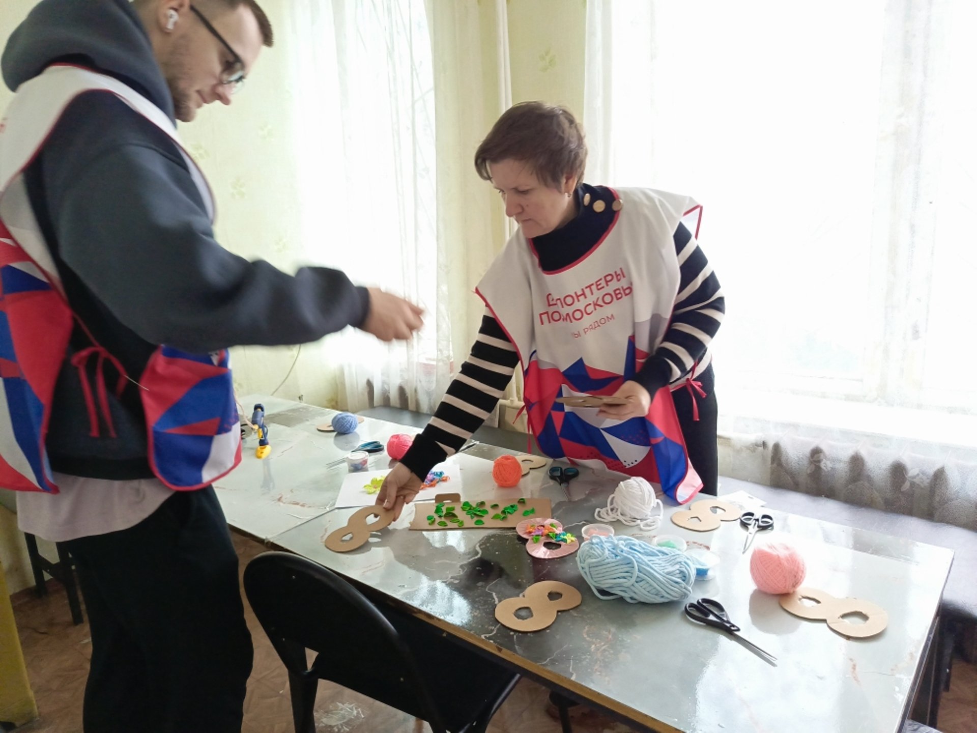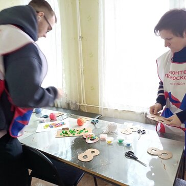 Волонтеры готовят заготовки для открытки, раскладывают весь необходимый материал для работы.