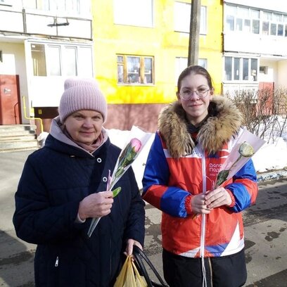 Поздравление женщин с Международным женским днем на улицах города. Раздача цветов и открыток.