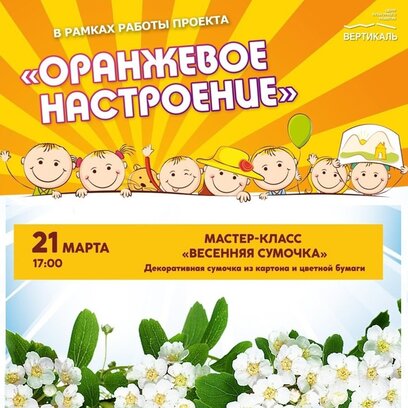 Мастер - класс "Весенняя сумочка" проведёт культорганизатор Анастасия Зиновкина, при поддержке участников Волонтёрской группы "Свежий ветер" и активистов Движения Первых МБУК Пущинский ЦКР "Вертикаль". Участники мастер - класс научатся делать из картона и цветной бумаги декоративную сумочку, украшая её бумажными цветами.