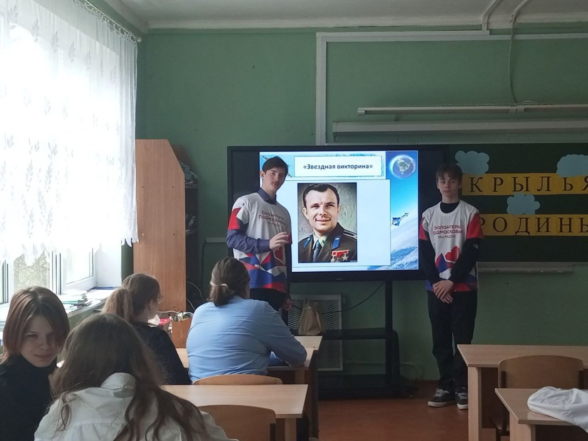 Волонтёры Серебряных Прудов провели мероприятие, посвящённое Дню космонавтики в МБОУ "Совхозная СОШ", на котором обсудили с ребятами первый орбитальный полет вокруг Земли советского космонавта Юрия Гагарина на космическом корабле «Восток».
