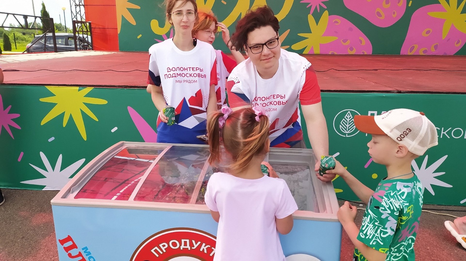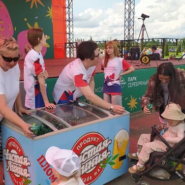 Задача добровольцев раздавать детям мороженое в Парке "Серебряный" на праздничном мероприятии ко "Дню Защиты детей". Необходимо раздать 1 000 порций мороженого детям.
