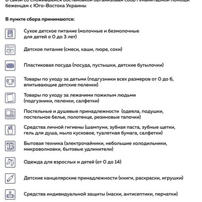 В качестве гуманитарной помощи можно приносить продукты питания, посуду, средства личной гигиены, предметы первой необходимости. Особая поддержка необходима детям, для них можно оставить разные игрушки, книги и канцелярские товары.