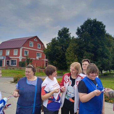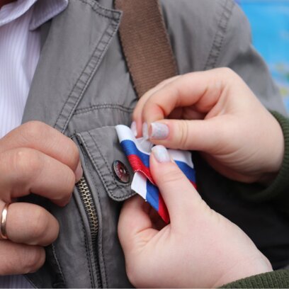 Раздача ленточек триколор в честь Дня Государственного флага Российской Федерации