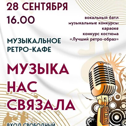 Приглашаем жителей и гостей города Пущино в музыкальное ретро - кафе "Музыка нас связала"! Можно стать не только зрителями, но и участниками песенного Батла, исполнить песни под караоке. Вас ждут музыкальные конкурсы, а также, конкурс костюма "Лучший ретро - образ".