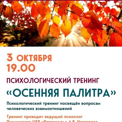 Авторский Психологический тренинг Анастасии Владимировны Нестеровой "Осенняя палитра" посвящён вопросам человеческих взаимоотношений.
