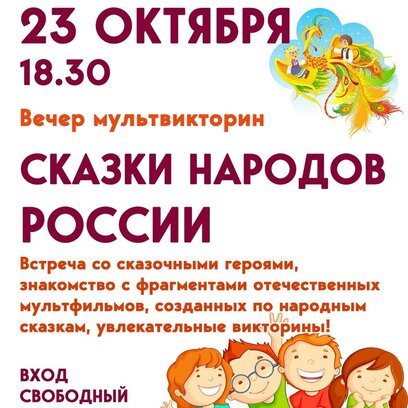 Роиглашаем юбных жителей города на Вечер мультвикторин "Сказки народов России"! Ничто так не отражает самобытность характера народа, как его сказки!