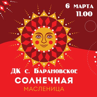 "Открывайте ворота – масленица к нам пришла !" - именно под таким названием пройдёт праздник Масленицы в с. Барановское 6 марта. Откроют праздник творческие коллективы ДК с. Барановское, затем всех ждёт необыкновенная театрализованная программа, разнообразные масленичные состязания и потехи, выявления главного богатыря с. Барановское и многое другое. Ярким завершением масленичного гулянья станет чаепитие с блинами!