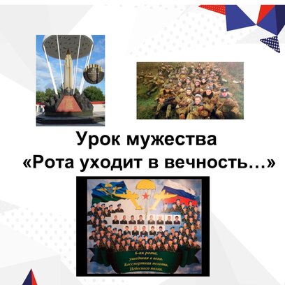 Урок мужества, посвящен Дню памяти 6-ой роты псковских десантников. Мероприятие включает в себя рассказ с презентацией и видеороликом о подвиге псковских десантников и направлен на патриотическое воспитание молодежи.