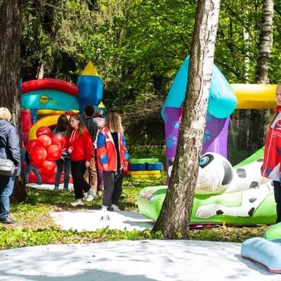 Наши волонтеры помогали с детьми на детских аттракционах и батутах.