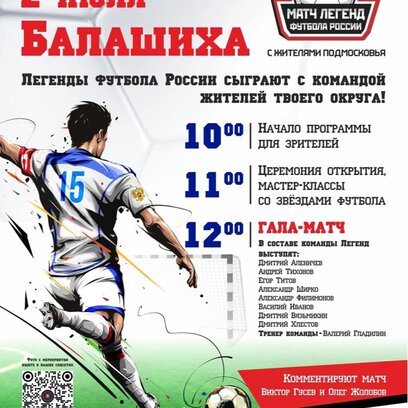 На футбольном поле встретятся звезды отечественного футбола, воспитанники спортивной школы Балашихи и местные жители.