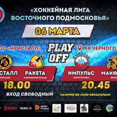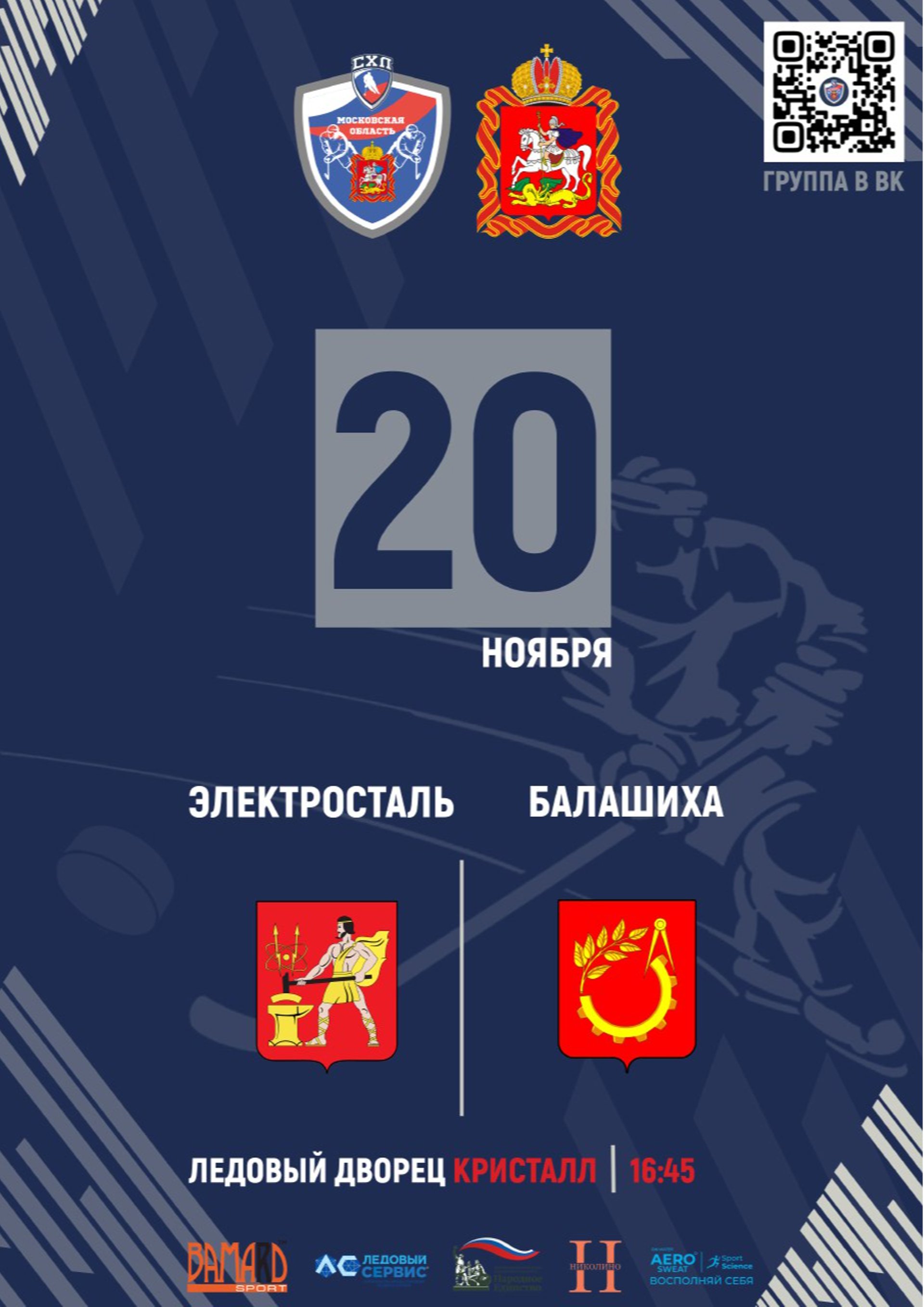 Хоккейный матч между командами Подмосковной хоккейной лиги. Игры состоятся в в феврале в Ледовом дворце спорта "Кристалл". Вход свободный, но в связи с трудной эпидемиологической ситуацией и осуществляется по QR-коду.