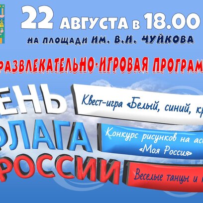 Праздничное мероприятие, посвященное Дню Флага России. В программе: квест-игра "Белый, синий, красный", конкрус рисунков на асфальте "Я рисую Россию", тематический аквагримм. Необходима помощь двух волонтеров. Задачи для волонтеров - проведение конкурса рисунка на асфальте, раздача лент "триколор", аквагрим (нарисовать всем желающим флаг России")