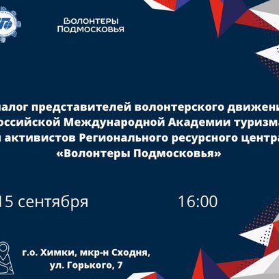 15 сентября в 16:00 на территории Российской Международной Академии туризма пройдет встреча в форме живого общения представителей волонтерского движения академии и активистов Регионального ресурсного центра «Волонтеры Подмосковья» городского округа Химки, для обсуждения плана работы на учебный год 2022-2023 с целью взаимодействия волонтерских объединений.