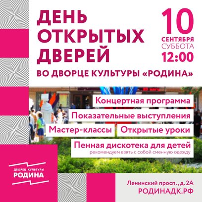 Приглашаем всех жителей г.о. Химки 10 сентября в 12:00 на День открытых дверей Дворца культуры «Родина»