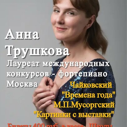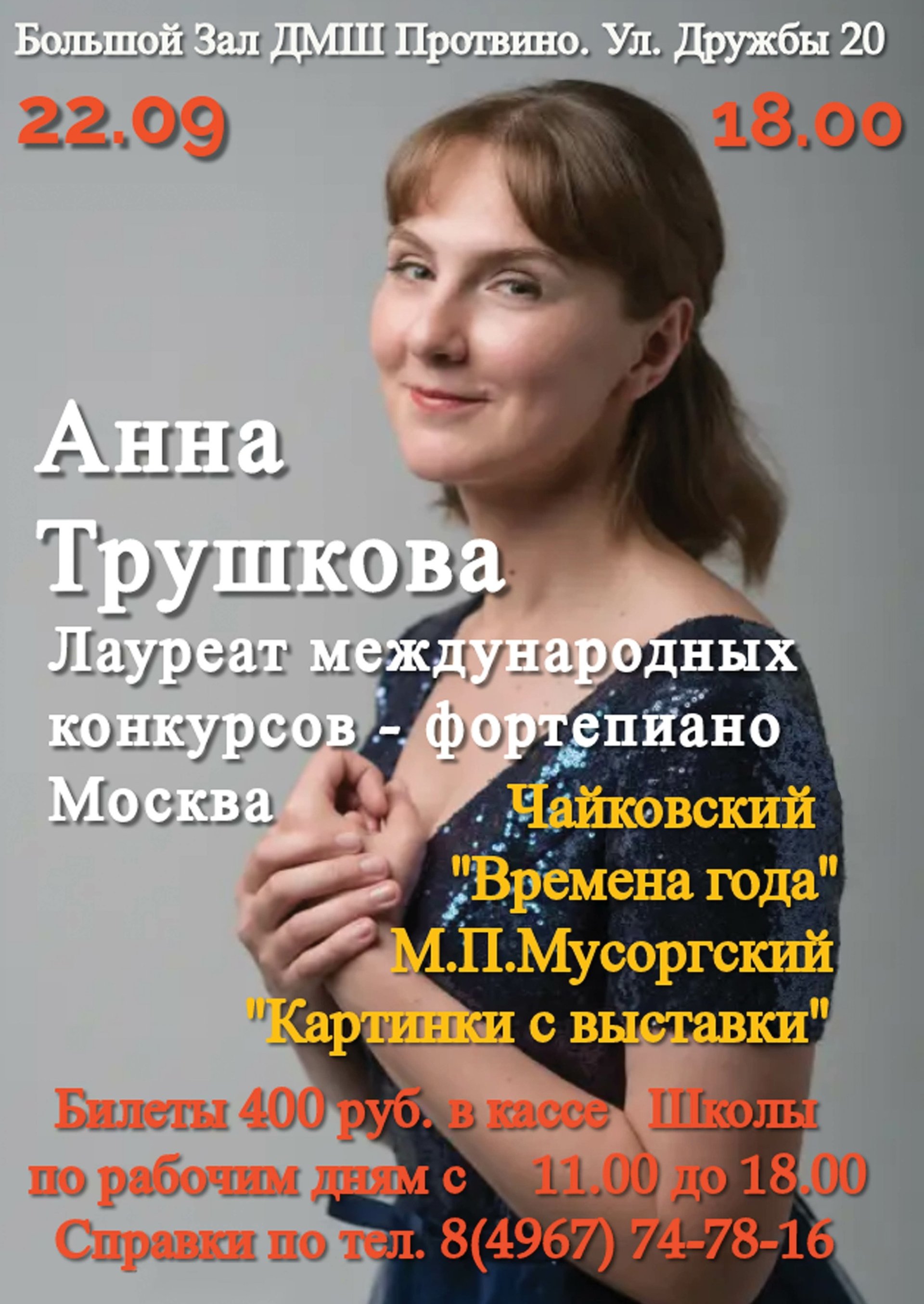 22 сентября в 18.00 в большом зале Музыкальной школы МАУДО «ДШИ» города Протвино состоится концерт Анны Трушковой.