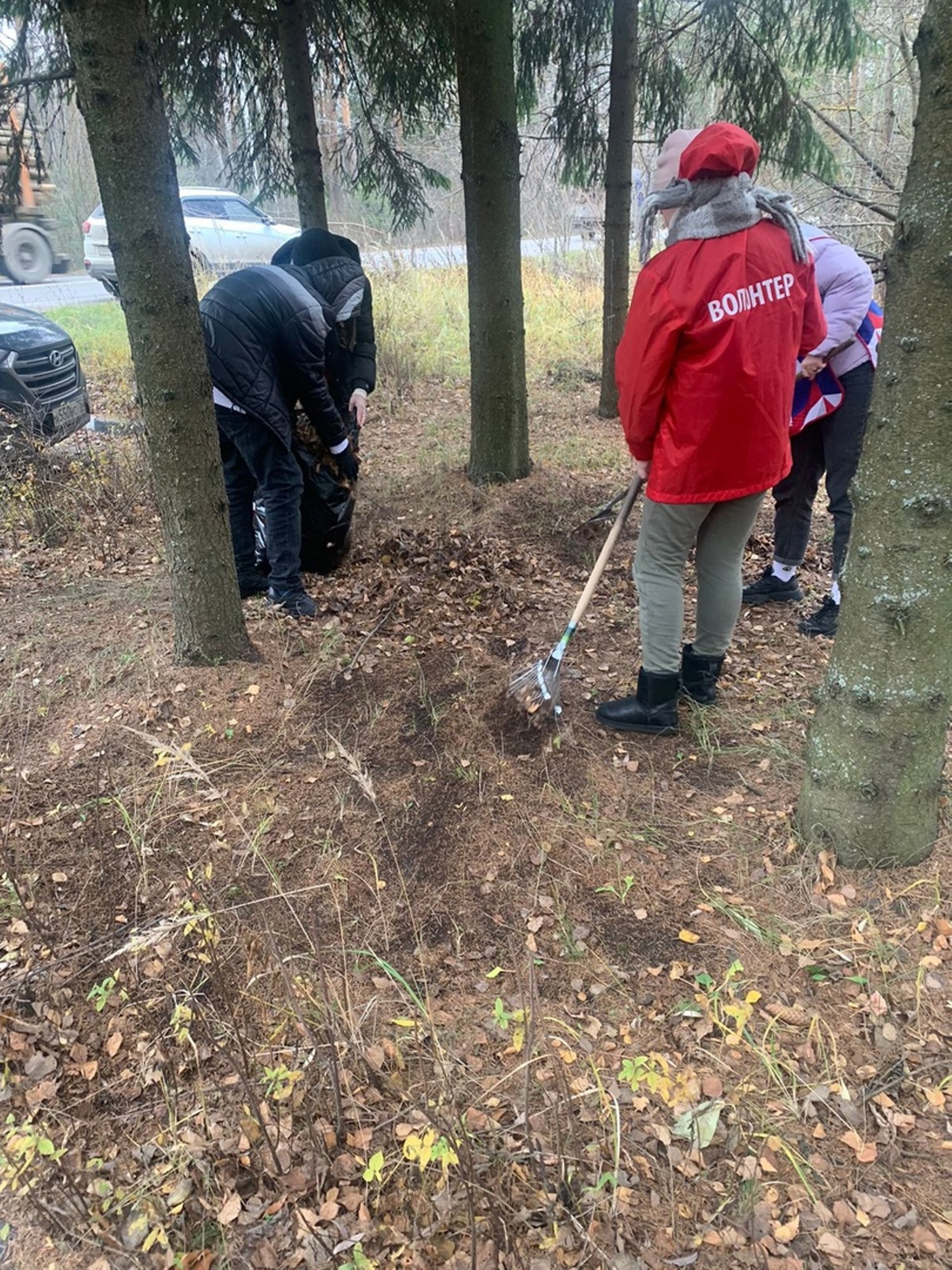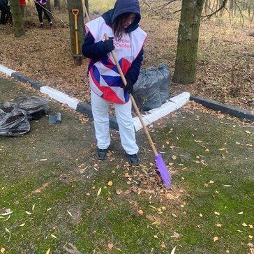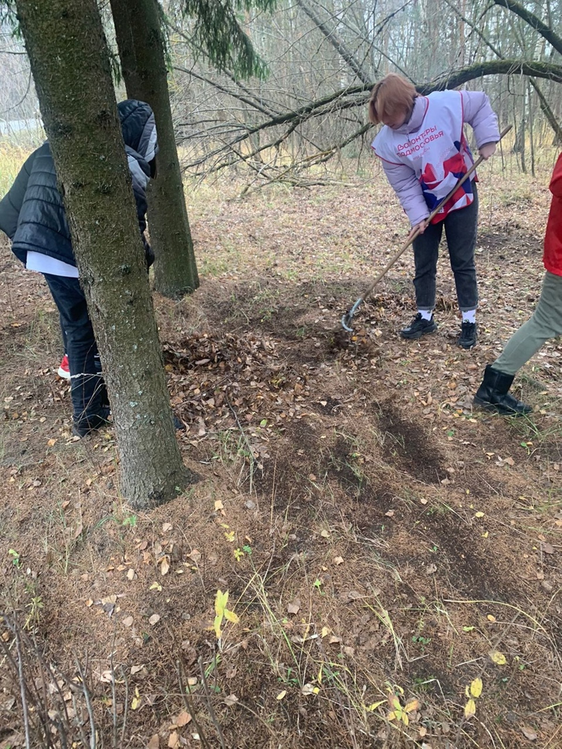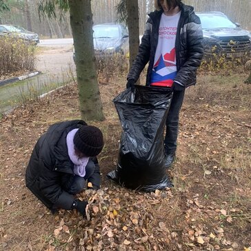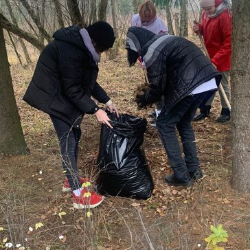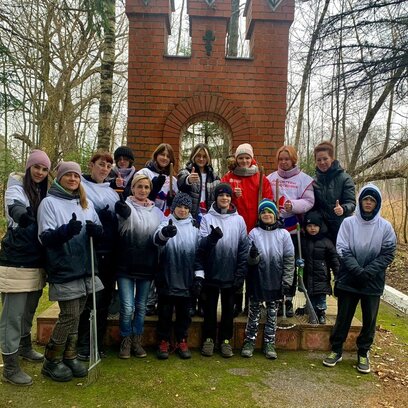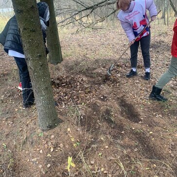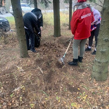 Волонтеры помогают убирать памятник и сажают деревья.