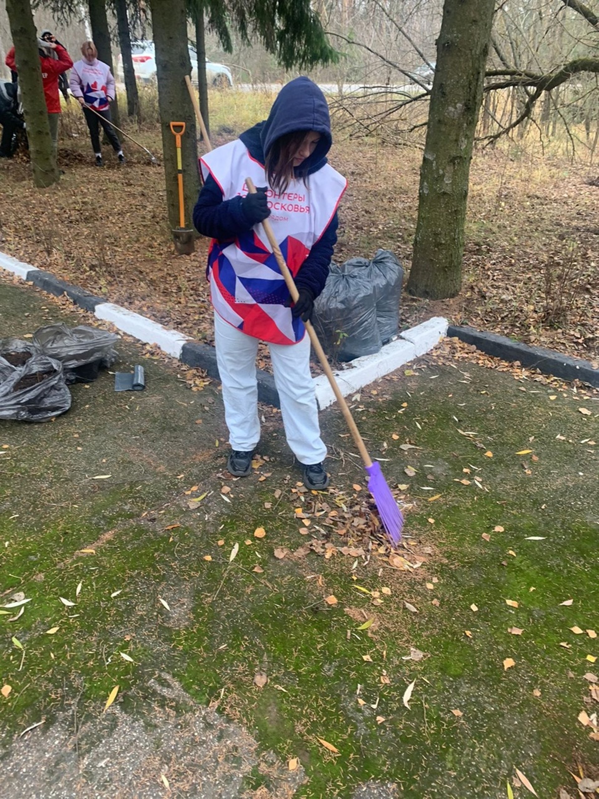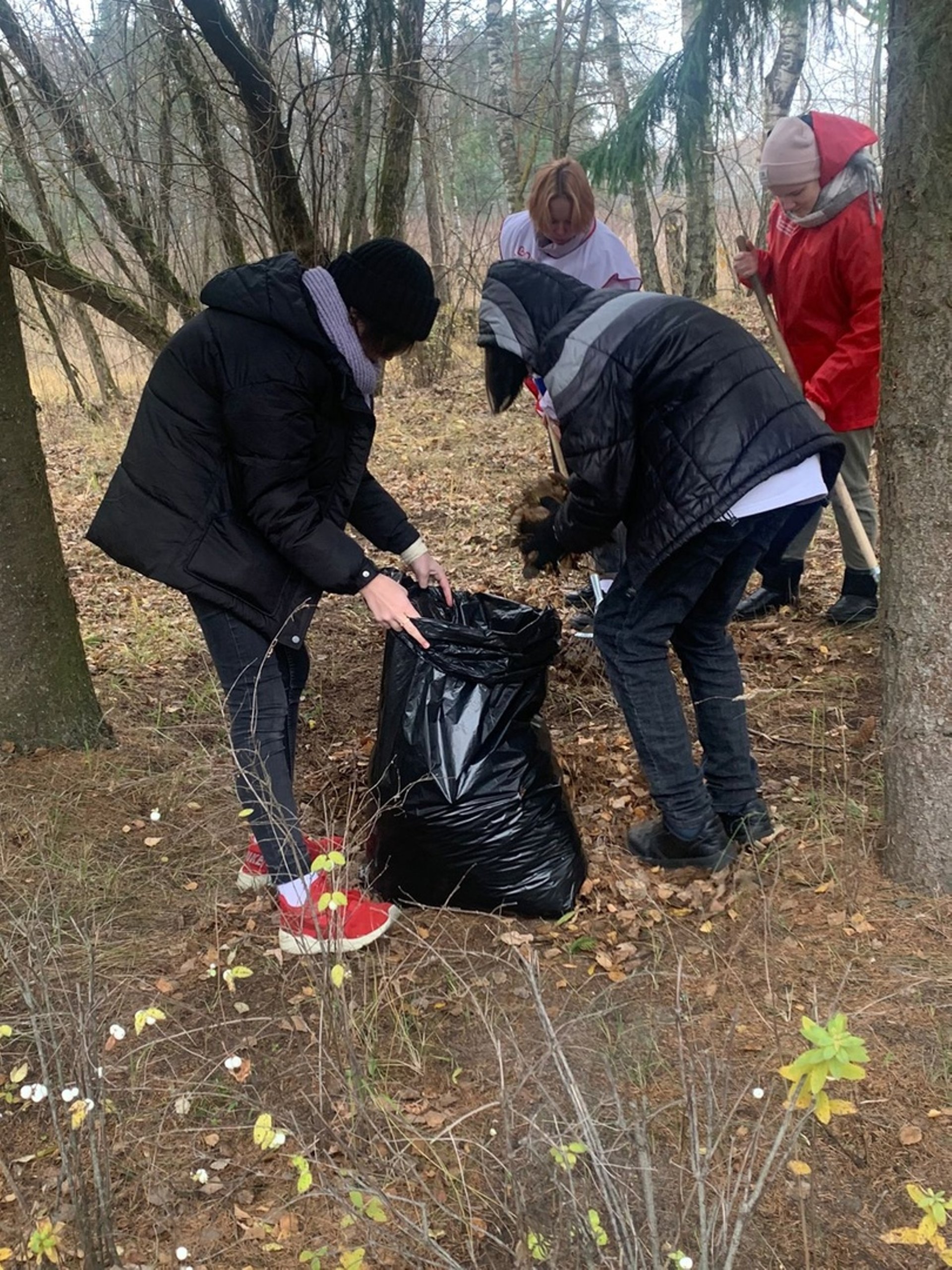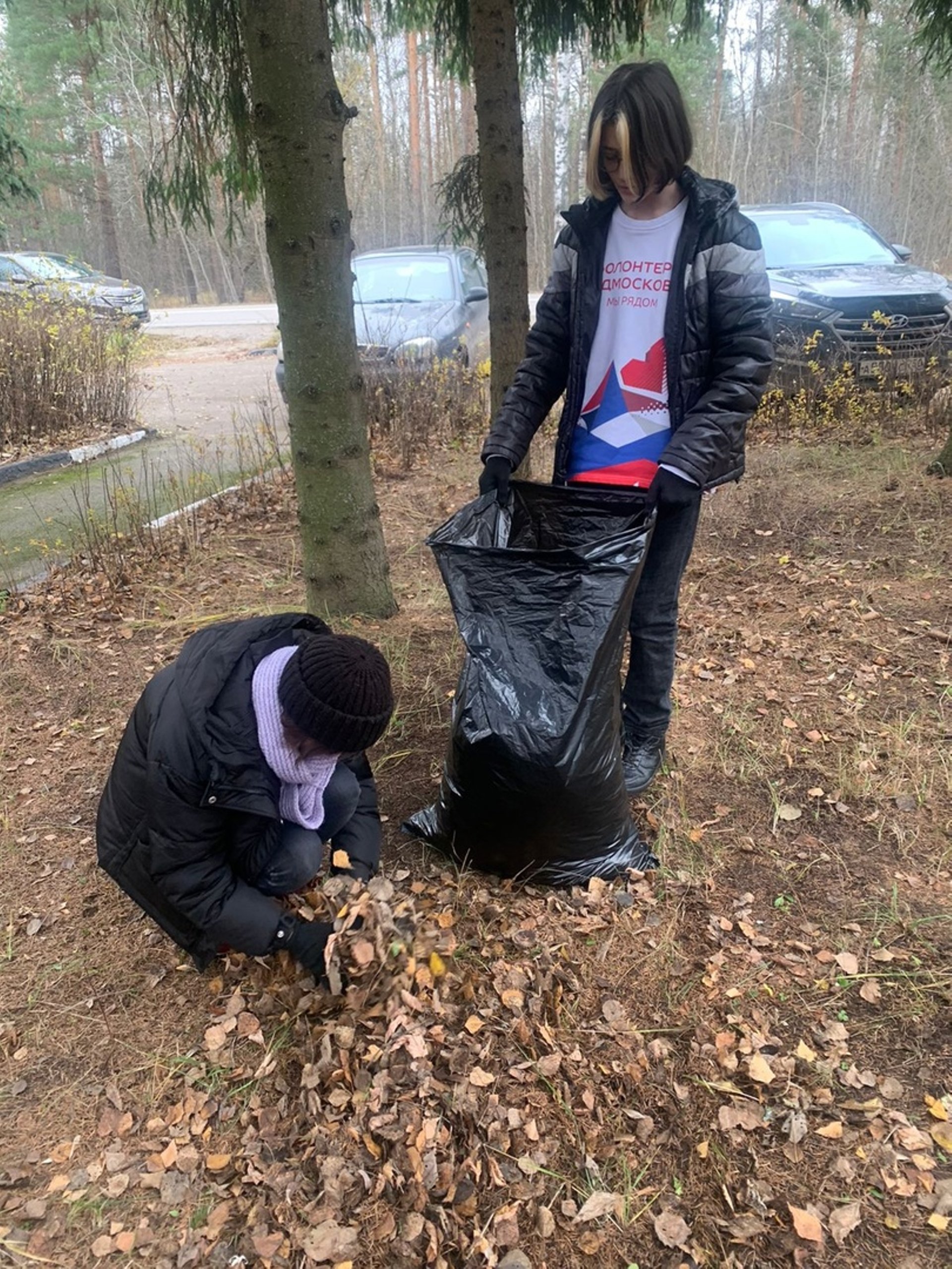 Волонтеры помогают убирать памятник и сажают деревья.
