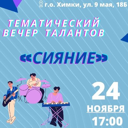 24 ноября в 17:00 в Региональном ресурсном центре пройдет вечер талантов молодежи городского округа Химки «Сияние» в рамках Дня уникального таланта. Адрес: г.о. Химки, ул. 9 мая, 18Б.