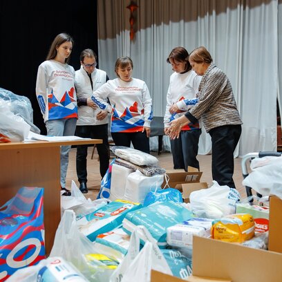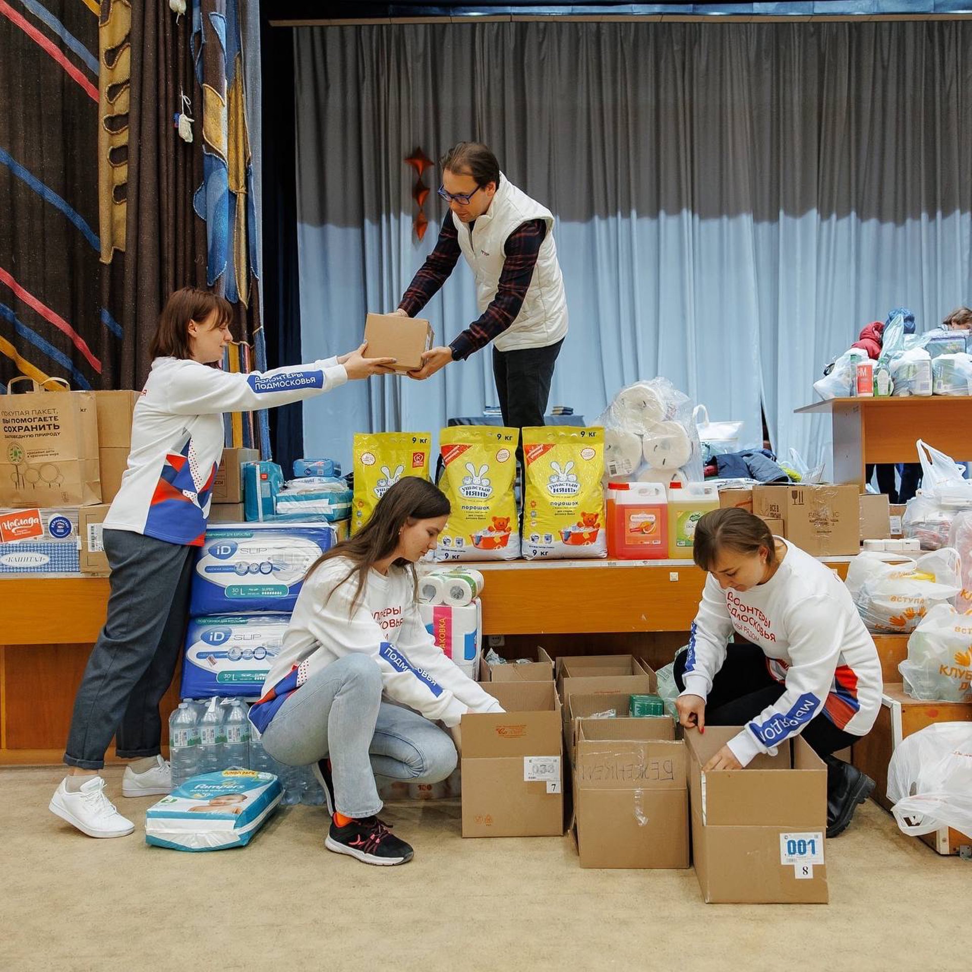 Волонтеры помогают в переноске, сортировке и упаковке вещей, продуктов.