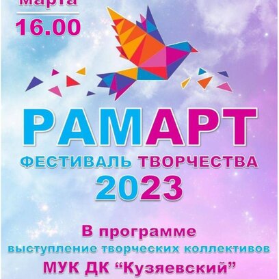 18 марта 2023 г. в 16.00 в Доме культуры "Кузяевский" проводится фестиваль творчества РАМАРТ 2023. В программе: выступление творческих коллективов МУК "ДК Кузяевский".
