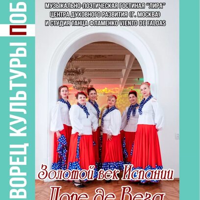 8 апреля в 15.00 музыкально- поэтическая гостинная "Лира" представляет программу с Золотой век Испании" приучастии студии танца фламенко Ведущая расскажет гостям о жизни и творчестве выдающегося испанского поэта. Вход свободный, д.п. Удельная, ул. Солнечная 35.