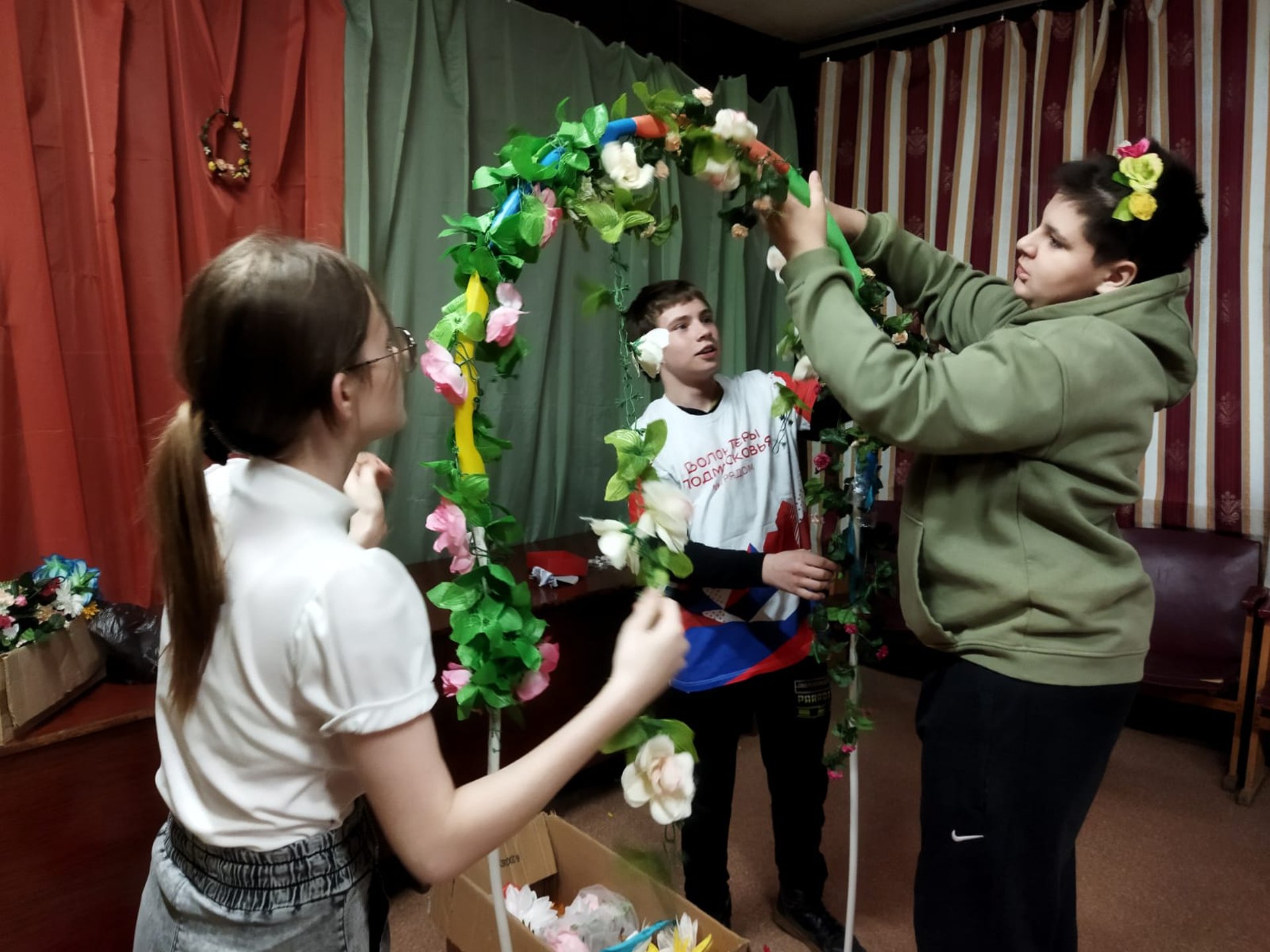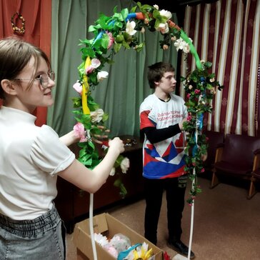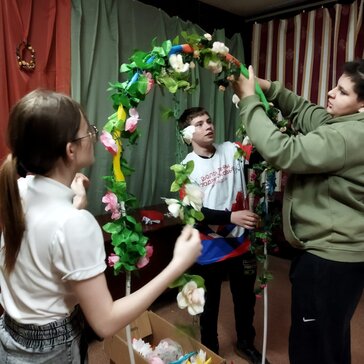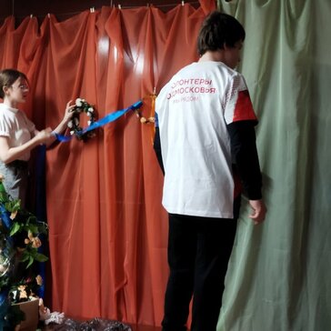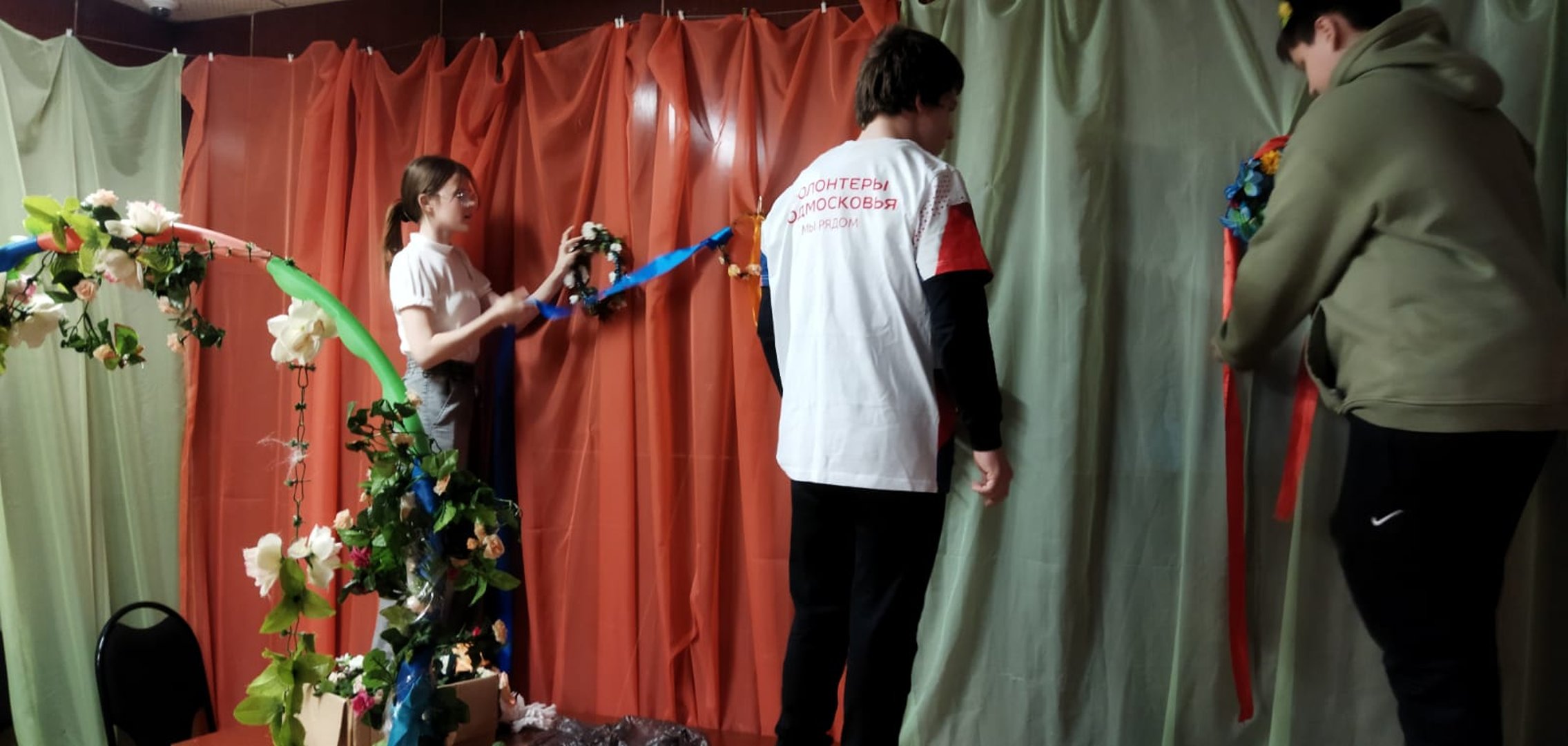 Волонтеры участвуют в подготовке к детскому празднику: украшаю зал, гладят костюмы, устанавливают декорации.