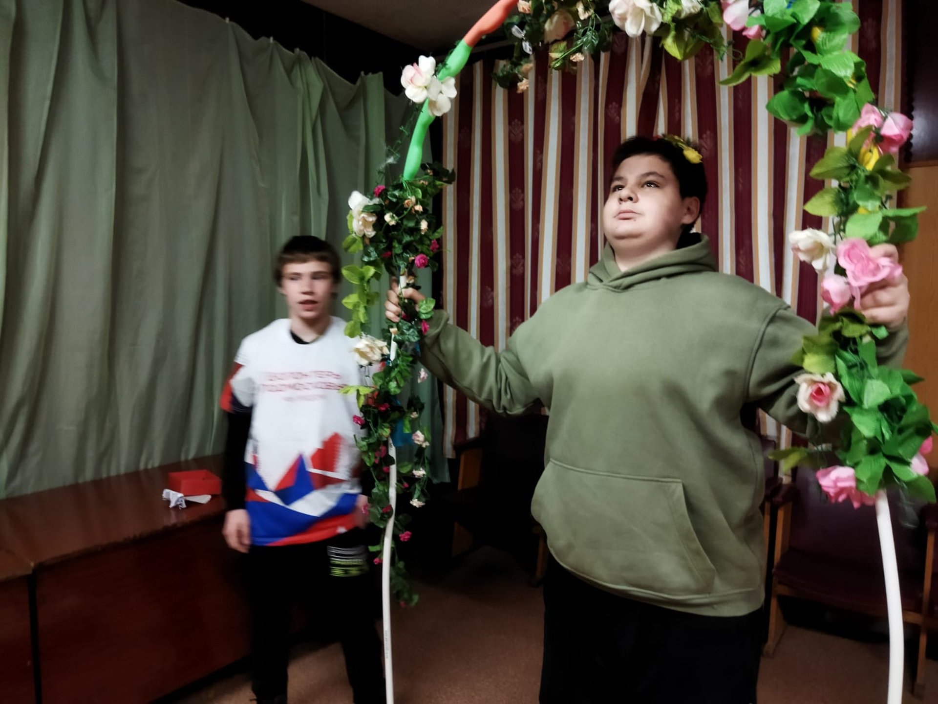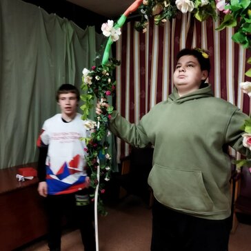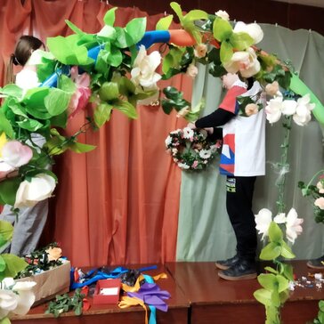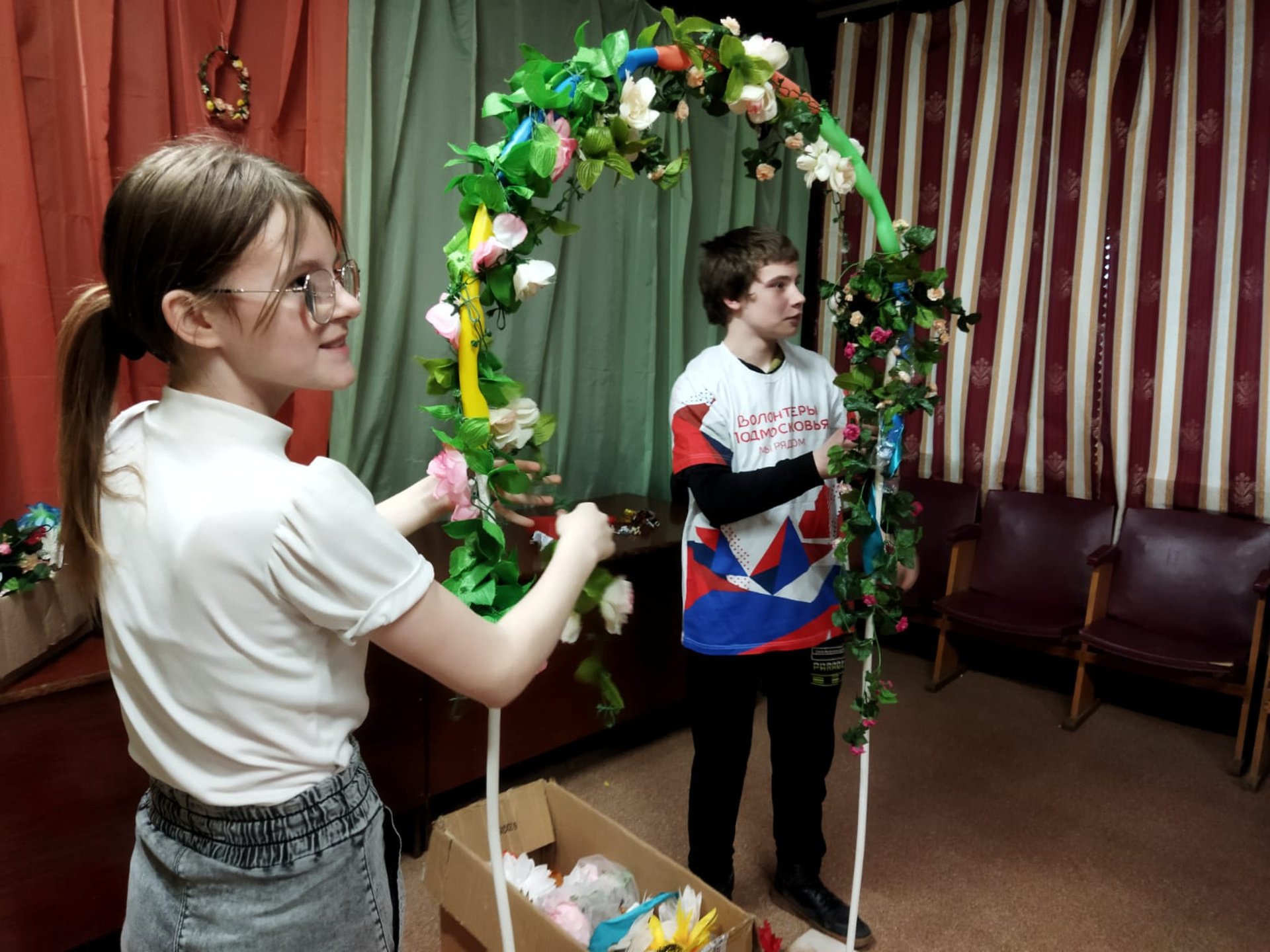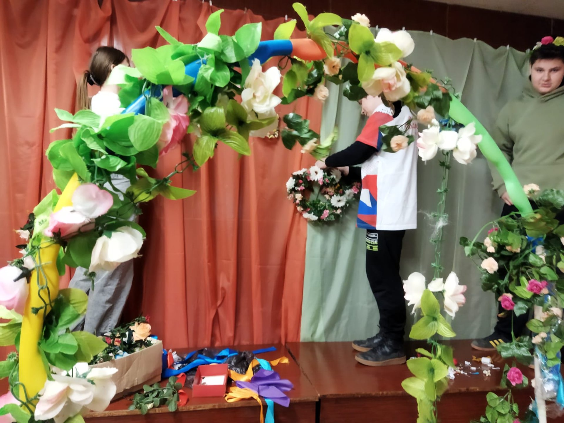 Волонтеры участвуют в подготовке к детскому празднику: украшаю зал, гладят костюмы, устанавливают декорации.