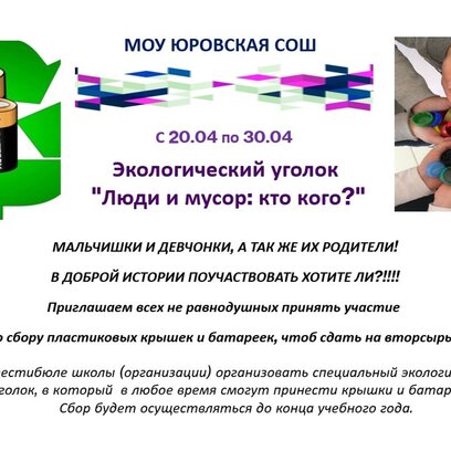 МОУ Юровская СОШ. Волонтеры в школе (организации) организуют специальный экологический уголок к, в который в любое время смогут принести крышки и батарейки. Приветствуется, если экологический уголок будет выполнен из вторсырья. Так же проводится силами волонтеров информирование, какого типа пластиковые крышки можно собирать, организуют сбор и в завершении проекта производят фасовку собранного. Проводится с 20.04 9:00 до 30.04. 18:00