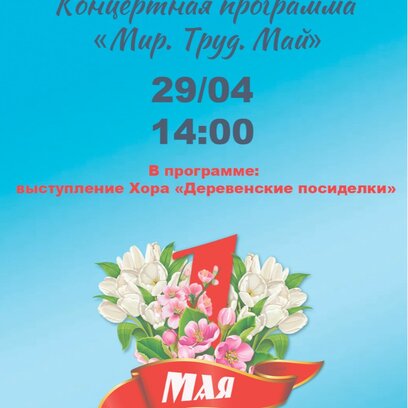 29.04.2023 в 14-00 состоится праздничное мероприятие "Мир. Труд. Май" (концерт), п.Дружба, ул.Ленина, д.1,2, парковая зона