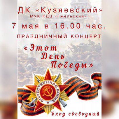 7 мая в 16.00 в Доме культуры Кузяевский состоится праздничный концерт"Этот День Победы!"Вход свободный.