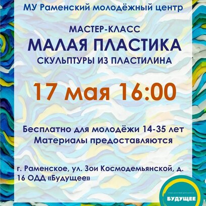 мастер-класс "Малая пластика" в отделе досуговой деятельности "Будущее". Материалы для занятия предоставляются.
