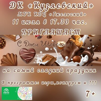 ДК "Кузяевский" МУК КДЦ " Гжельский" 11 июля в 17.30 приглашает на самый сладкий праздник " С Днём шоколада!"В программе игры, конкурсы и ???7+