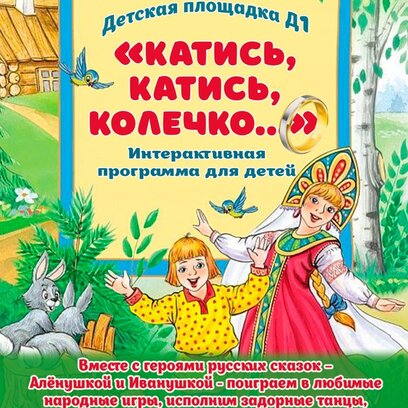 Герои русских сказок Алёнушка и Иванушка порадую требят весёлой интерактивной программой "Катись, катись, колечко..." Вместе с героями русских сказок ребята отгадают сказочные загадки, поиграют в любимые народные игры, спяшут заводные танцы. ждёи гостей м весёлая эстафета, и встреча с Чудом!
