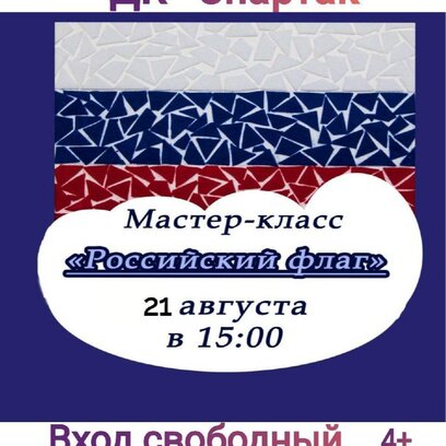 21 августа 2023 года в 15.00 в ДК "Спартак" , п.Спартак пройдет мастер-класс "Российский флаг" посвященный Дню государственного флага Российской Федерации. Мероприятие организовано при участии волонтеров. Приглашаем Всех желающих!
