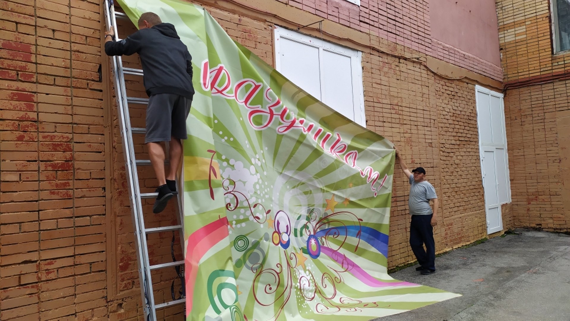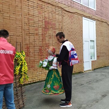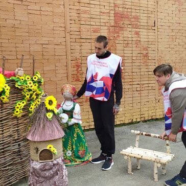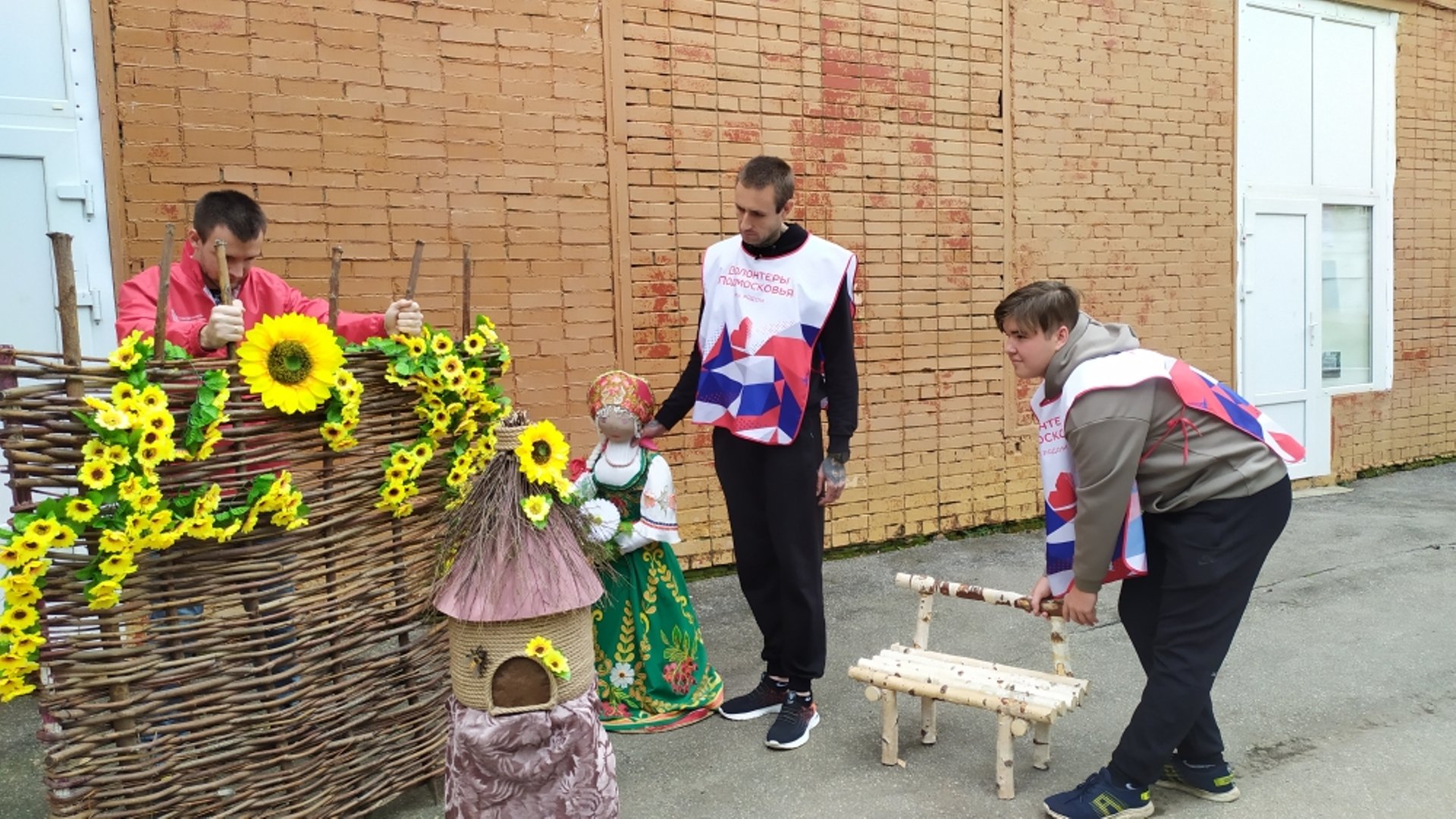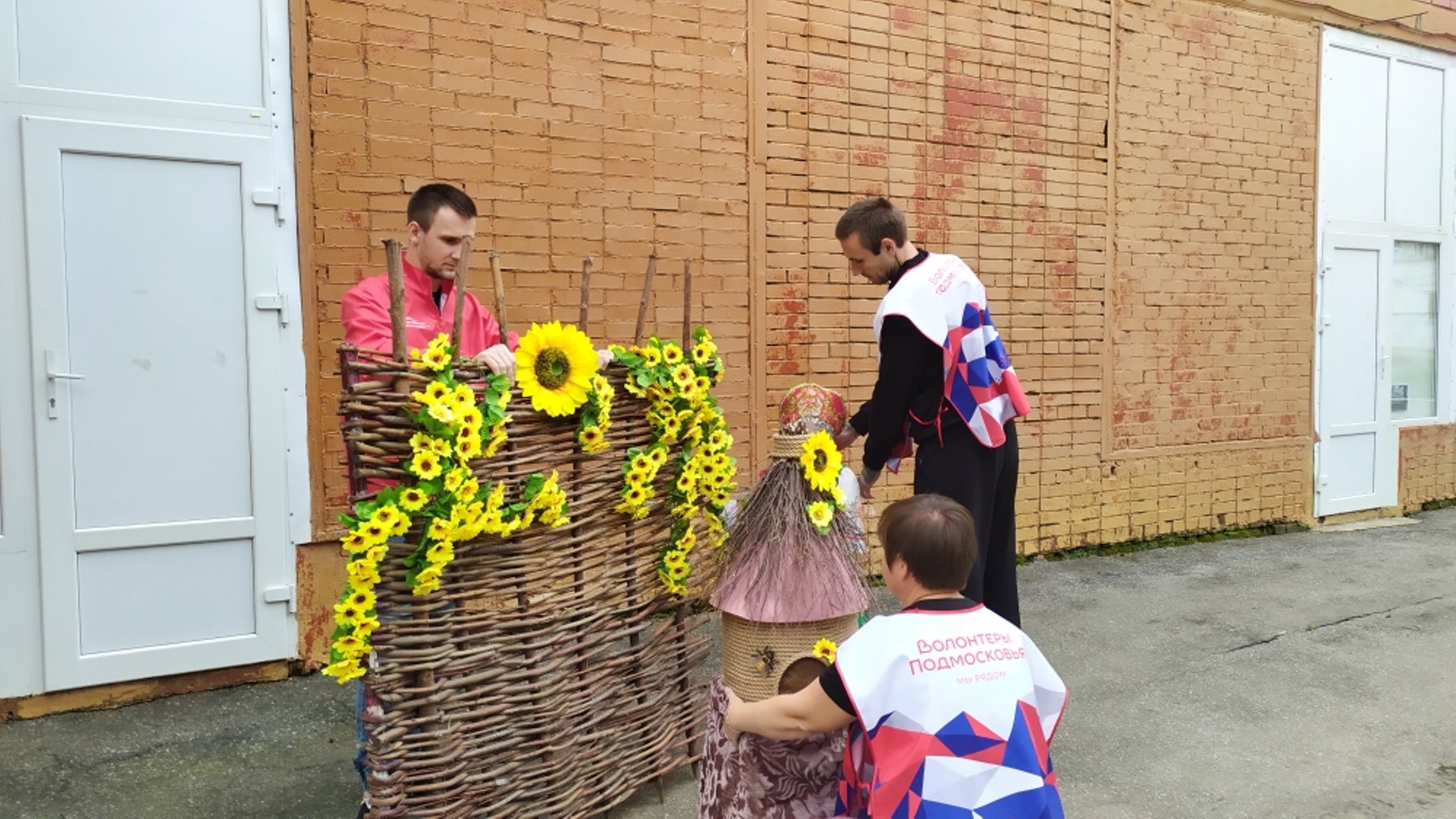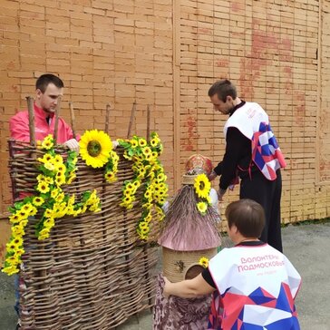 Волонтеры украшают, оформляют территорию для проведения праздника. Оформляют выставку картин местных художников. Встречают гостей.
