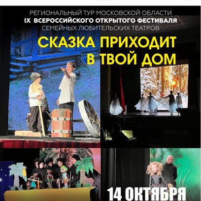 14-15 октября в г.о. Клин в Молодёжном центре "СТЕКОЛЬНЫЙ" при поддержке Министерства образования Московской области состоится Региональный тур IX Всероссийского открытого фестиваля семейных любительских театров "СКАЗКА ПРИХОДИТ В ТВОЙ ДОМ"