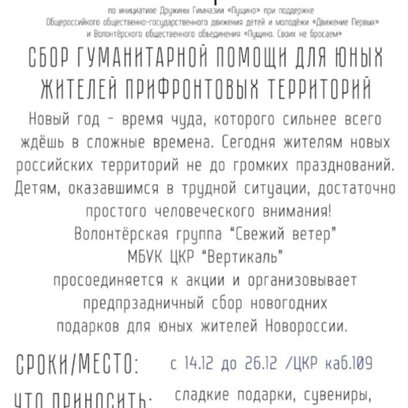 Участники Волонтёрской группы "Свежий ветер", активисты "Движения Первых" и сотрудники МБУК ЦКР "Вертикаль" г.о. Пущино присоединяются к акции и организуют сбор новогодних подарков для детей Новороссии.