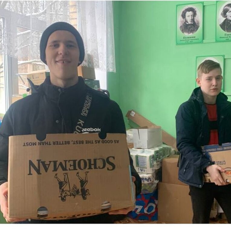 Разгрузка машины с гуманитарной помощью Волонтёрами на складе гуманитарной помощи в городском округе Кашира