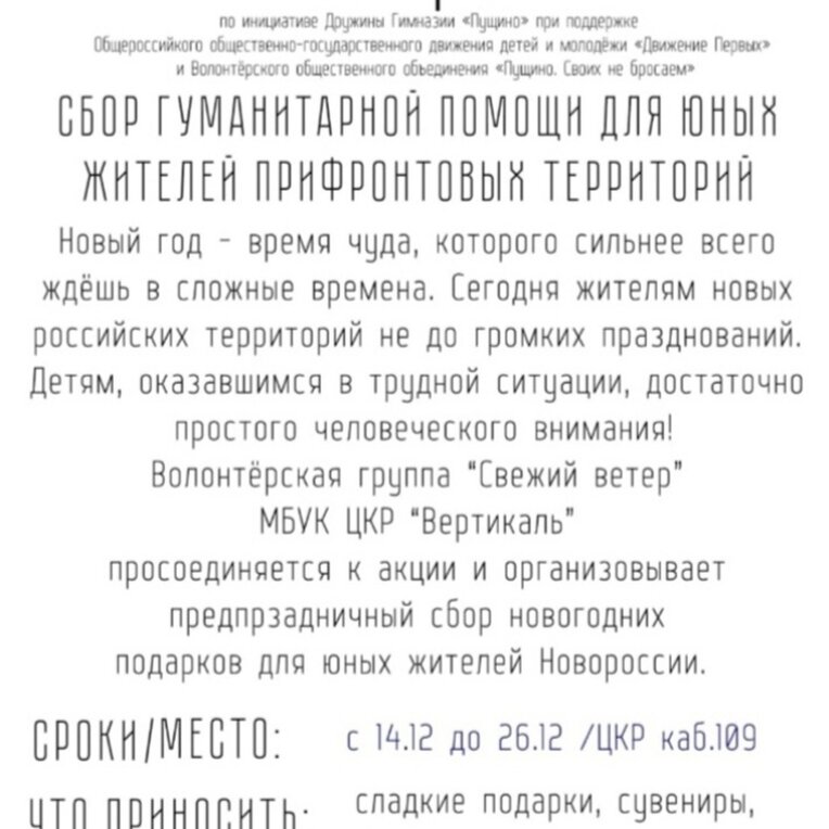 Акция "Сбор гуманитарной помощи для юных жителей прифронтовыфх территорий"