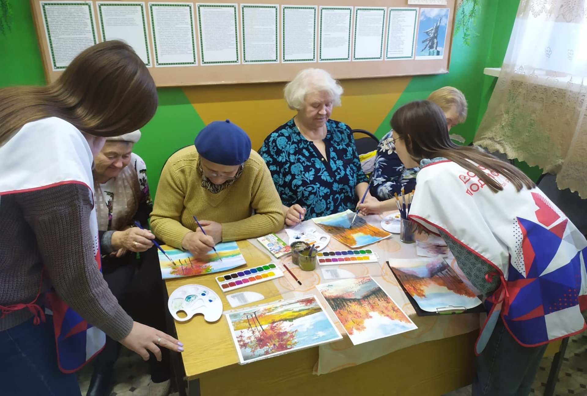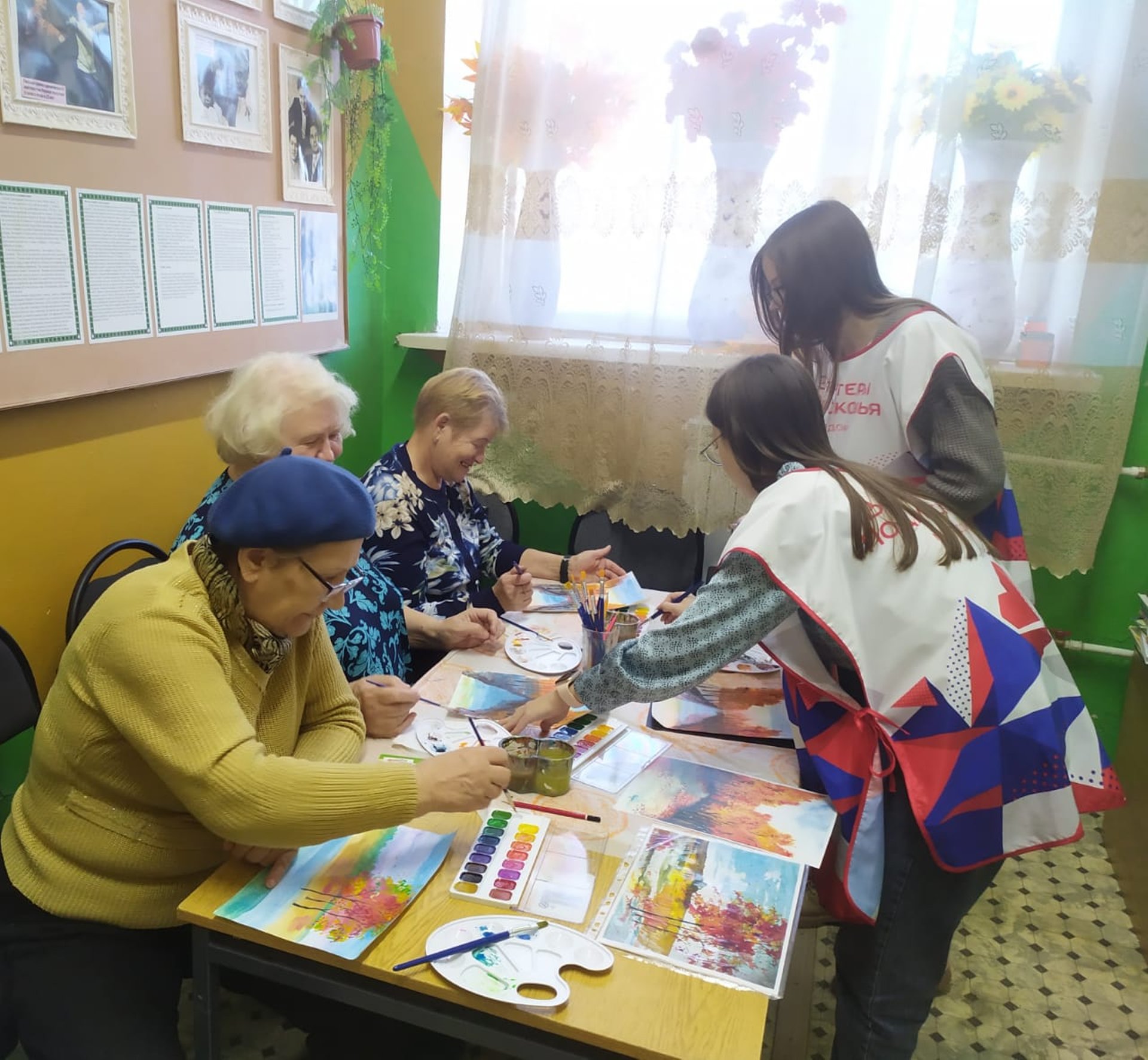 Помощь волонтёров при проведении мастер-класса с участниками программы Активное долголетие.