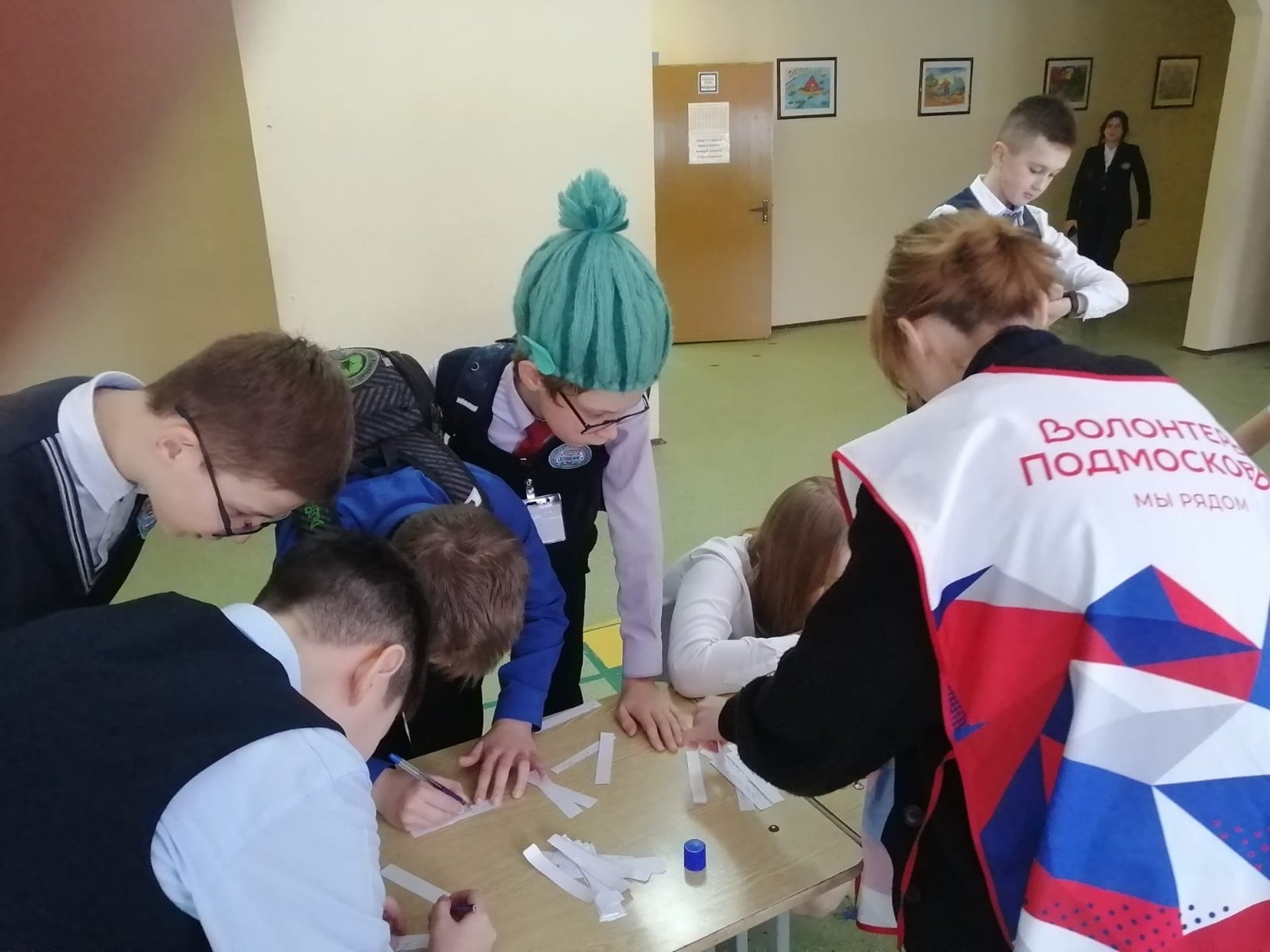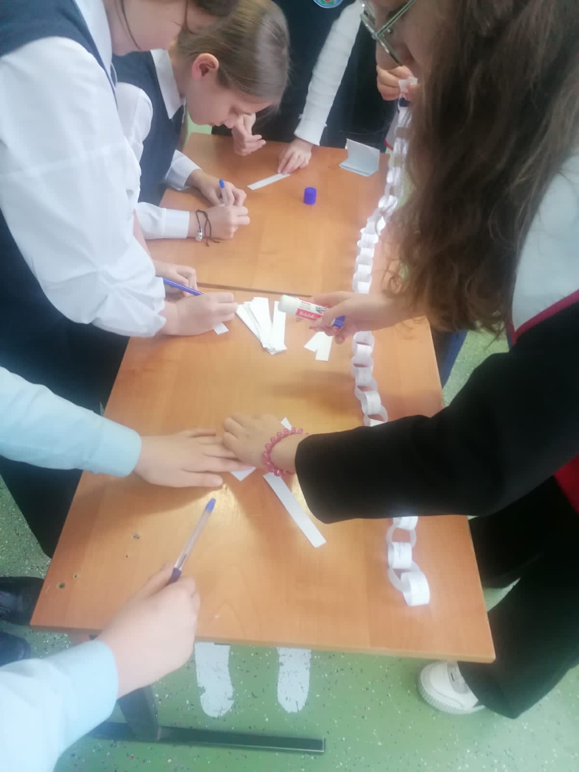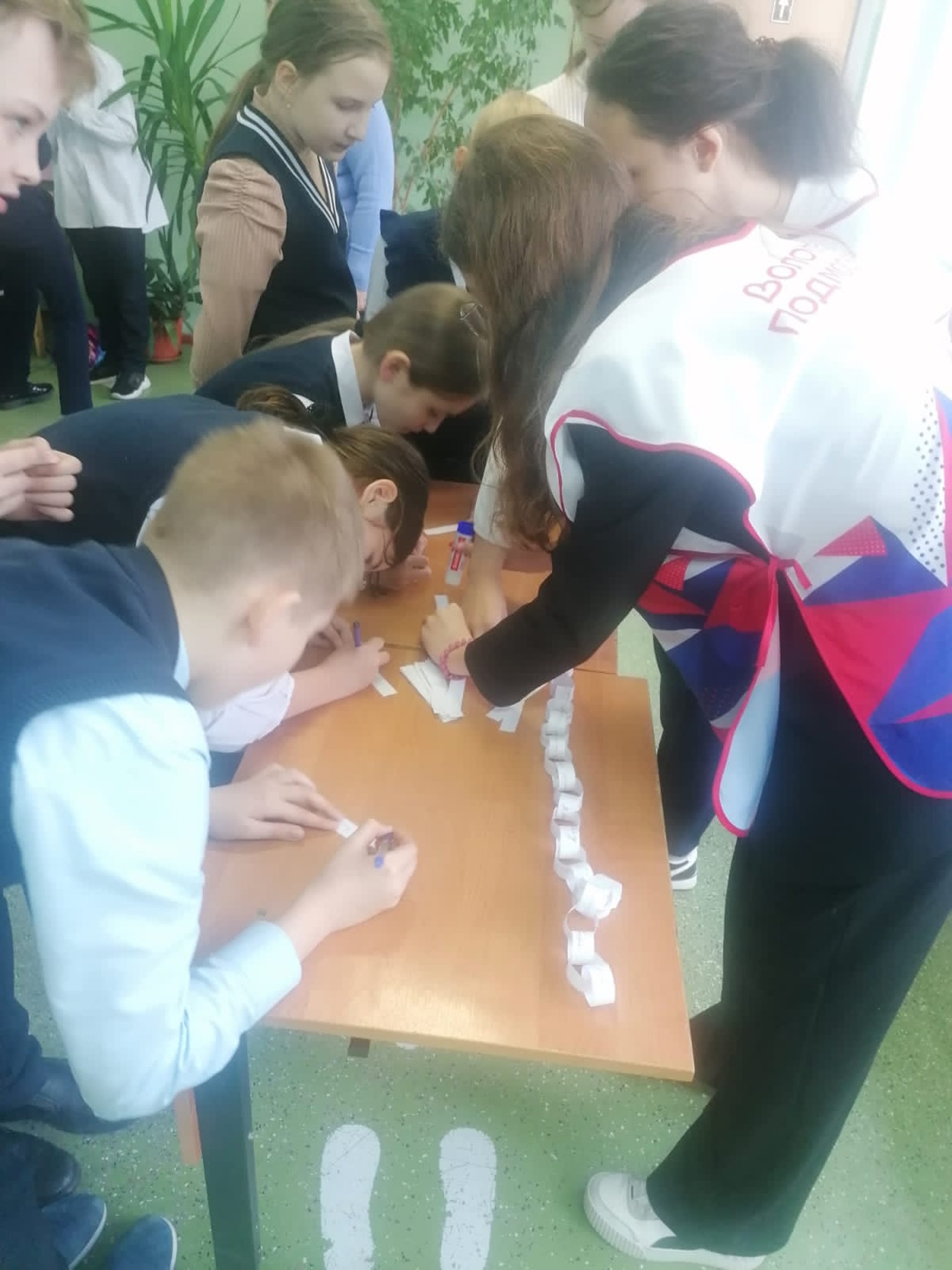 Ребята школы пишут пожелания на заготовках для гирлянды, затем складывают в общую и украшают