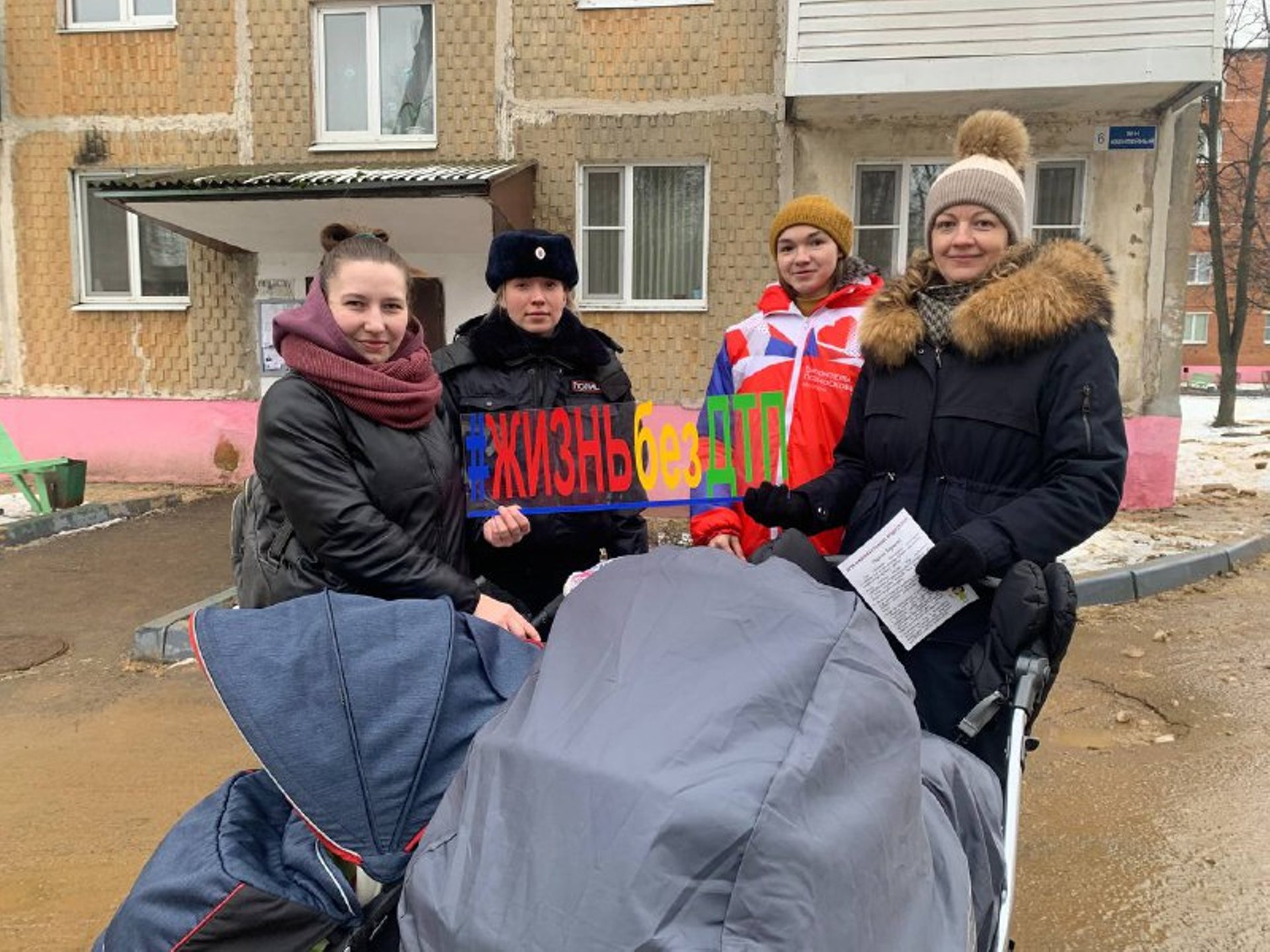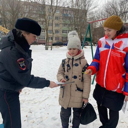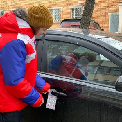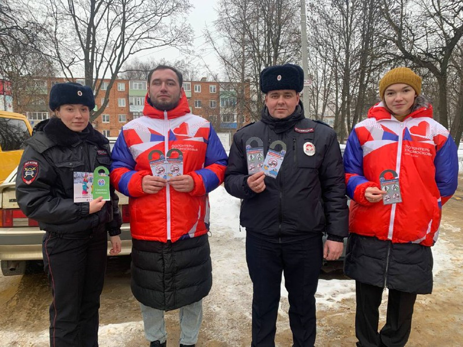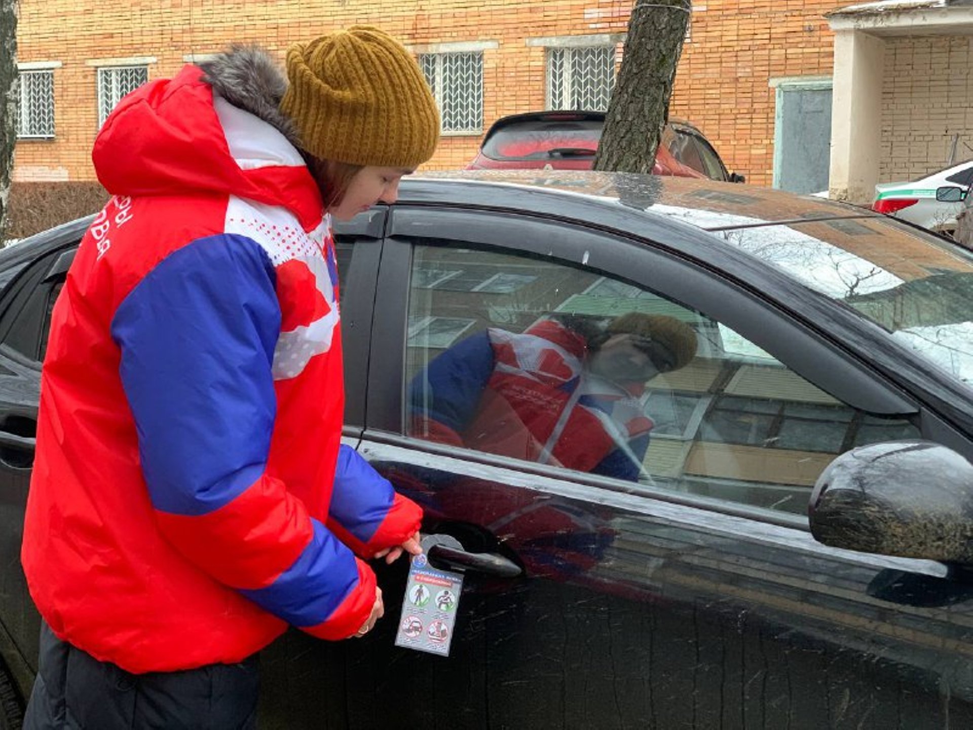 Представители дорожной полиции вместе с Волонтерами распространяют листовки с тематикой акции жителям дворов с призывами использования детских удерживающих устройств при перевозке малышей и наличия на верхней одежде световозвращающих элементов.